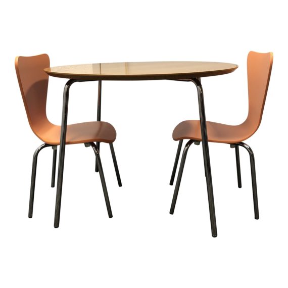 Design Plus Gallery presents a Room Board Children’s Table Set. This lovely mid-century inspired set is consisted of the Perch Table and a pair of little Jake Chairs. The table has a round maple stop with polished chrome legs. The chairs are a sofa organ finish with chrome legs. Let your little artist be creative.