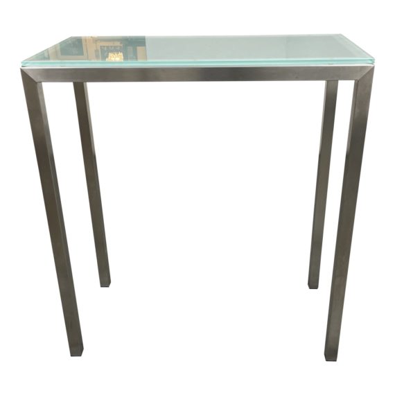 Design Plus Gallery presents a Room + Board Portico Glass + Steel High Table. Hand made in Wisconsin. Thin stainless steel base is constructed with mitered edges in a Parsons silhouette. Top is a partially opaque matte surface, tempered, easy to clean glass. Minor wear through out, table is in good condition. Bar height surface is ideal for a prep area, appliance, electronics or perhaps a aquarium. Easy to blend lines and materials makes it transitional for almost any decor.
