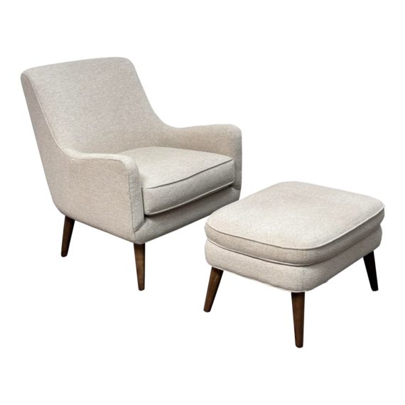 Design Plus Gallery presents a Chair + Ottoman Set from Room & Board. The Quinn is inspired by the ever so popular and of the moment Mid 20th Century design style. Fluid curves with a low profile while also taking up minimal space. The compact set will be great in a variety of placements as it is a neutral space saver. Is in good condition for its age + use. Made in the US.