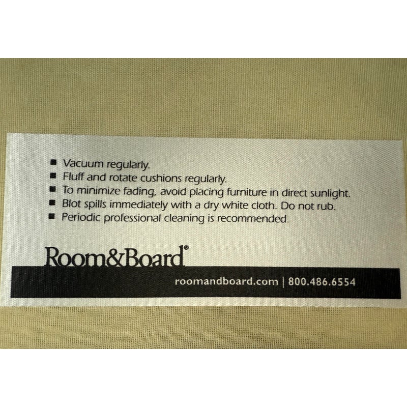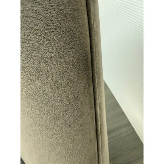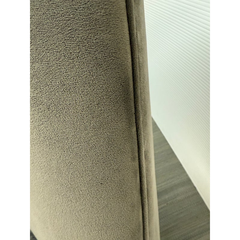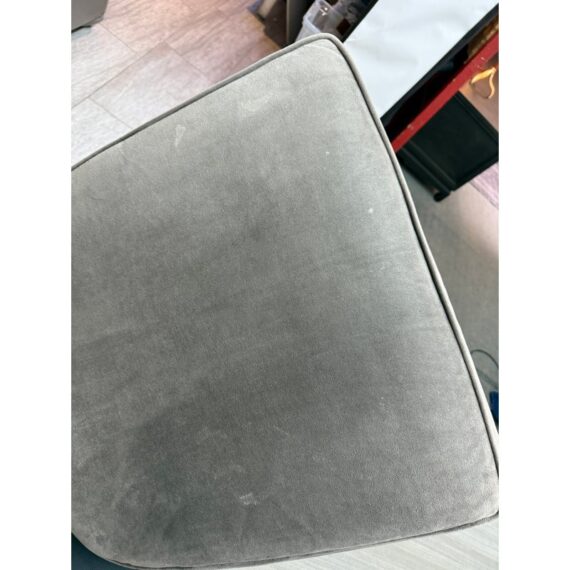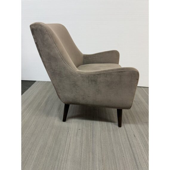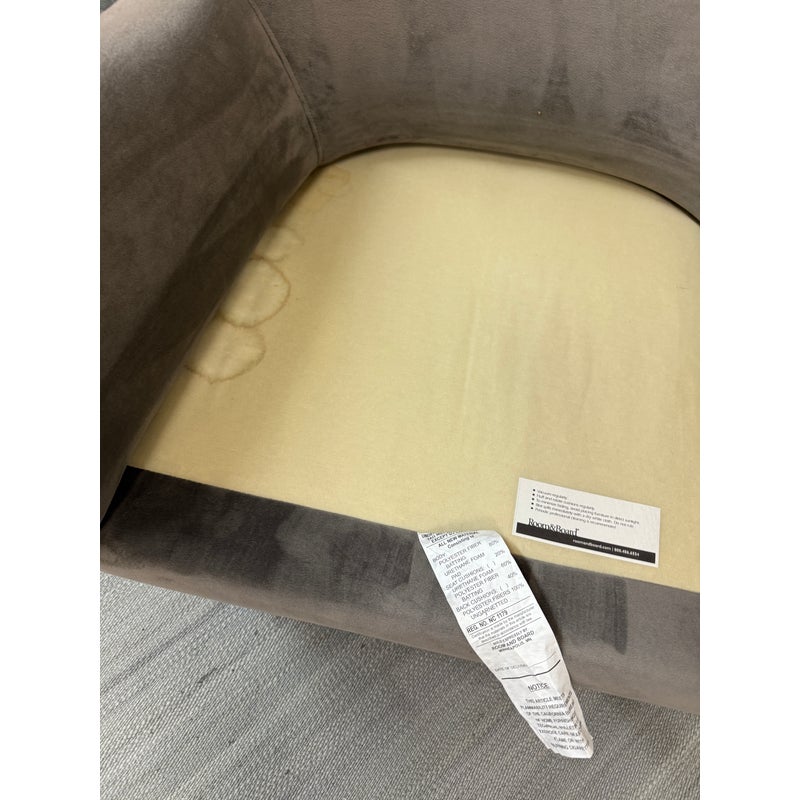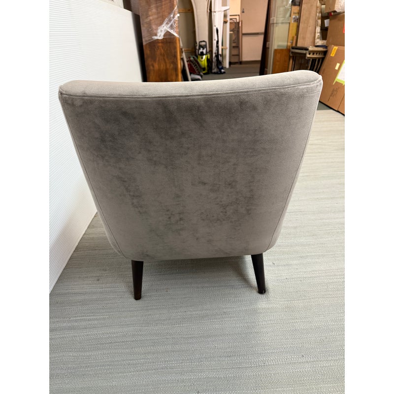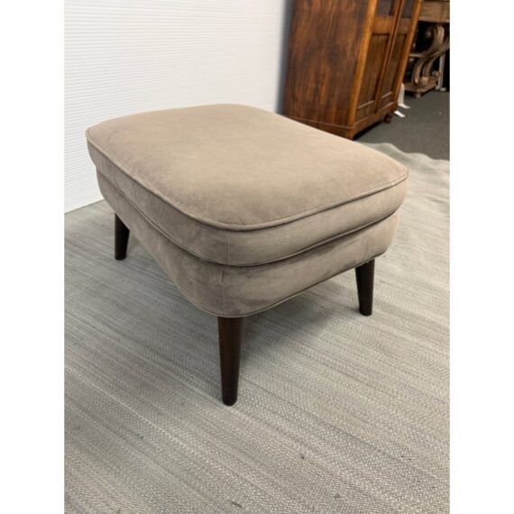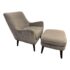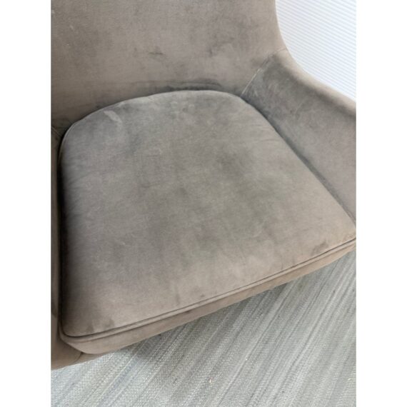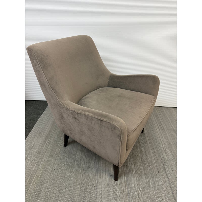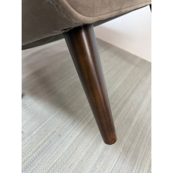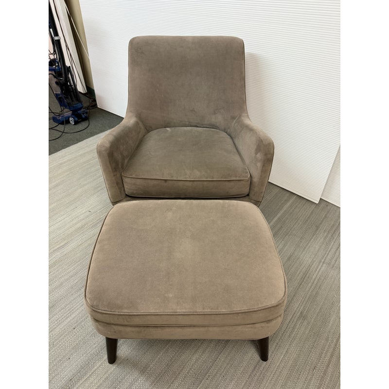Design Plus Gallery offers the Quinn Chair + Ottoman from Room & Board. The set offers a solid wood mid-century inspired frame that is tailored in a taupe performance velvet fabric with self welt detail. The chair has spring construction and a removable seat cushion that is filled with a combination of high density foam. Both the chair and ottoman have tapered walnut legs complete the look. The chair has minor wear, light soil and is in good condition for age and use.