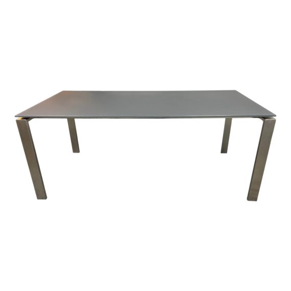 Design Plus Gallery presents a Rand Table by Room & Board. A unique architectural design gives the illusion of a floating top. The durable recycled natural stainless steel base has sleek corner-set legs that allow you to maximize seating. The top is a fogged grey glass. Minor wear from usage. Made in Minnesota, USA.