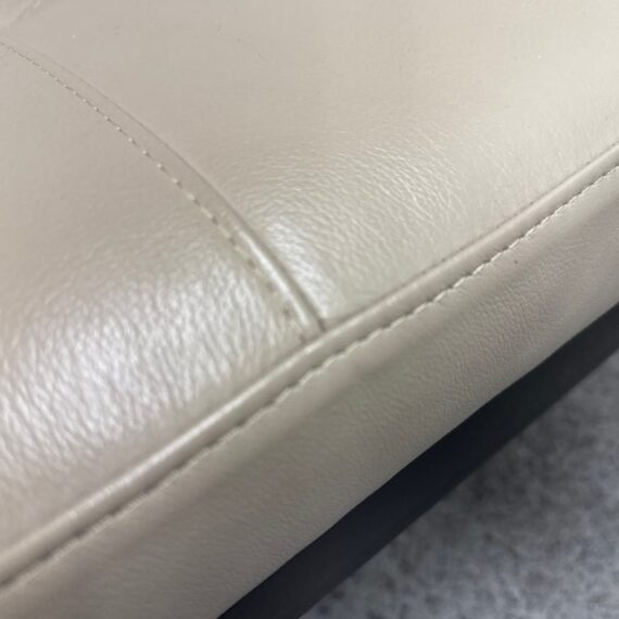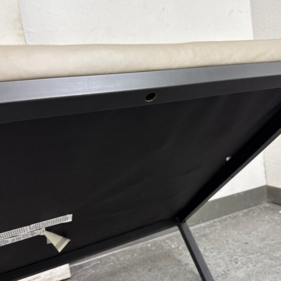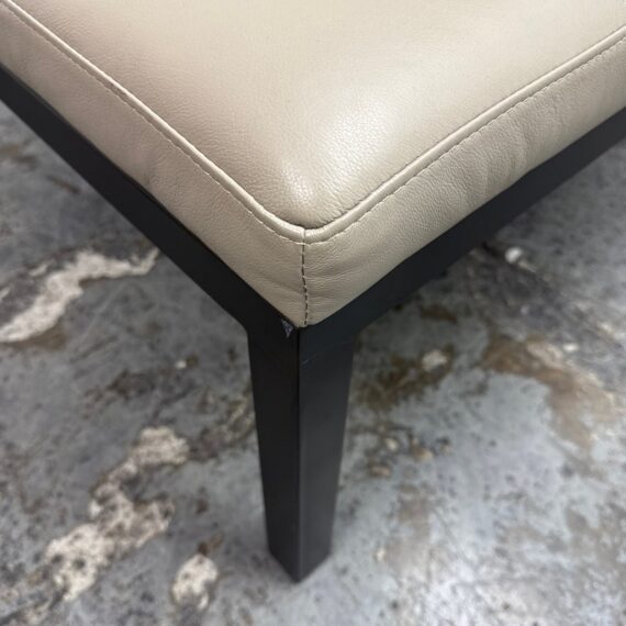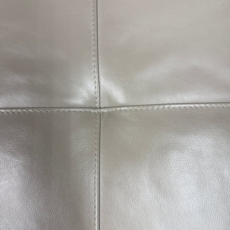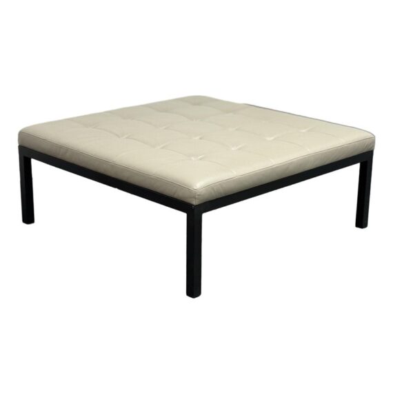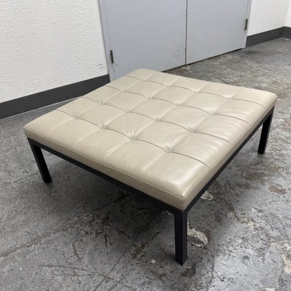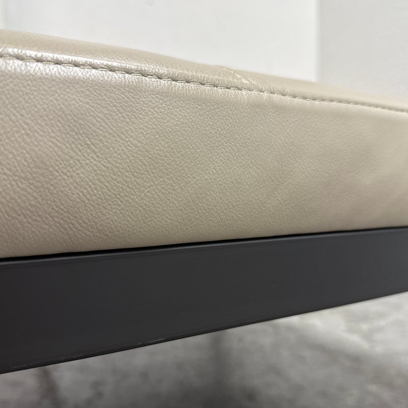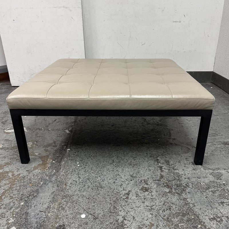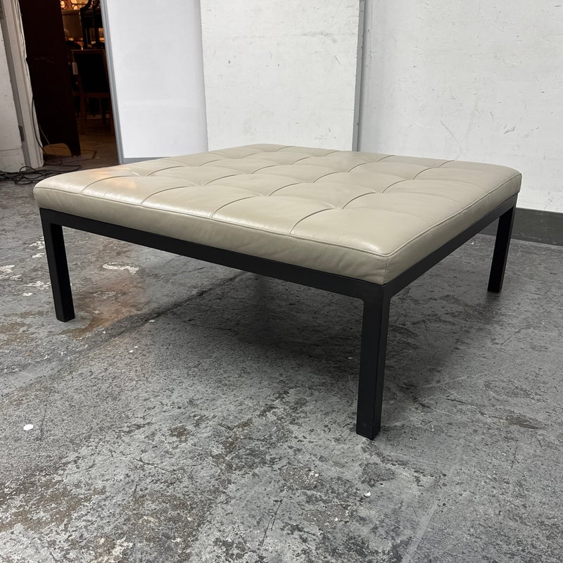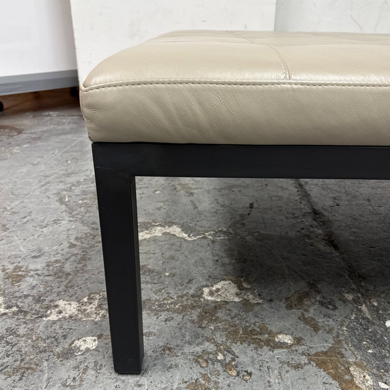 Design Plus Gallery presents the Ravella Ottoman in Tufted Gray Leather from Room + Board. With a sleek frame and tufted leather cushion, Ravella works as a bench, ottoman or cocktail table and offers a luxurious spot to put up your feet, serve drinks, or have a seat. It is on a natural steel base so sturdy enough to handle the greatest of all occasions. Is in good condition with minimal surface wear for its usage.