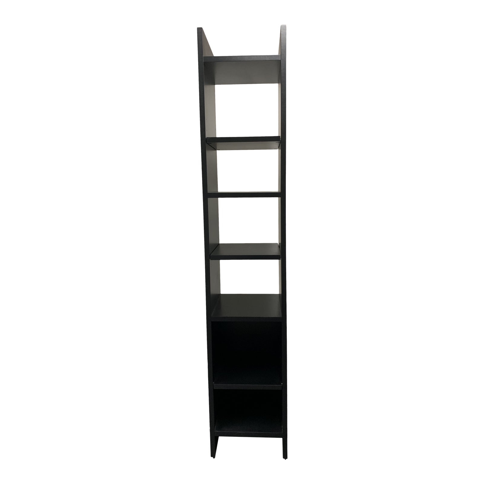 Design Plus Gallery presents a Bookshelf by Room and Board. A tall and narrow unit that consist of seven shelves. Three shelves are adjustable. Constructed of solid woods and veneers, the finish is black. The bottom two shelves have closed backings. Narrow in size can fit in many spaces.