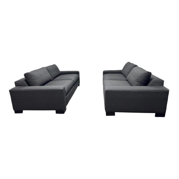 Design Plus Gallery presents a Pair of Townsend Sofas by Room & Board. Its clean and simple lines create a modern and sophisticated look. The sofa features two cushions over two cushions, providing ample seating for you and your guests. The block frame arms add a touch of style and structure to the overall design. The feet of the sofa are block wood legs in a black finish, adding a touch of contrast to the upholstery. This sofa is not only visually appealing, but also durable and comfortable. Its timeless design and high-quality materials make it a practical and stylish choice for any home. The fabric is a charcoal color. In good condition, visible and minimal wear from usage + age. This is a discontinued model.