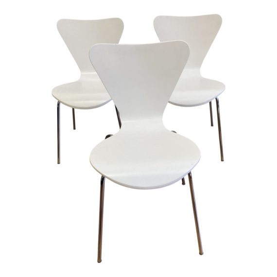Design Plus Gallery presents a Set of Three Jake Chairs by Room & Board. The light-hearted design offers the perfect balance of style, comfort and affordability. Crafted of molded plywood with chrome legs. The seat is in a white lacquer finish. Minor wear on frames.