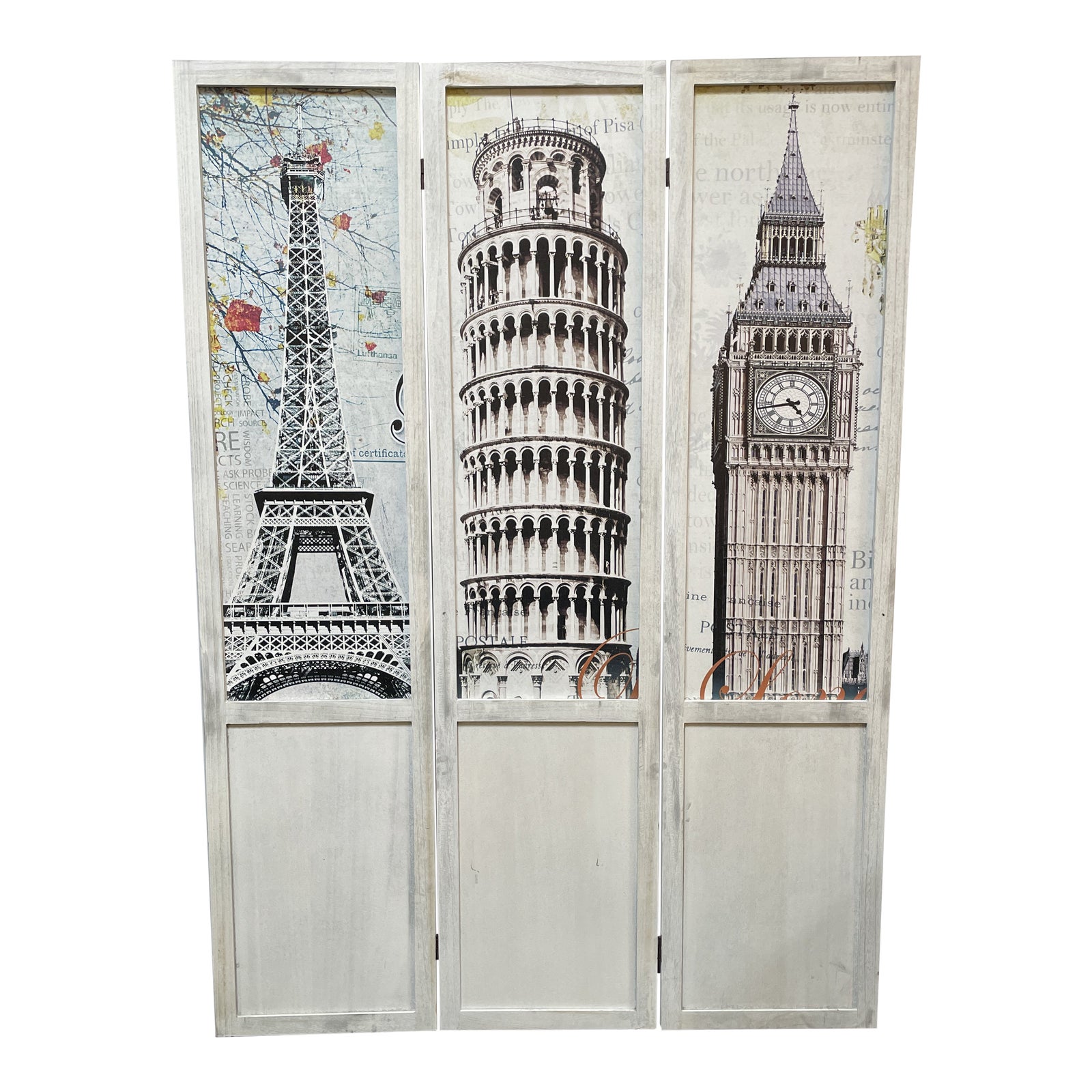 Design Plus Gallery presents a Room Divider. Perfect for the globe trotter or architecture lover, this room divider features famous European Landmarks. Take a journey from home to see the Eiffel Tower, Tower of Pisa, and the Big Ben! This single sided 3-panel screen divider can separate areas of a large room and provide privacy. Whitewashed wood frame keeps the setting airy.