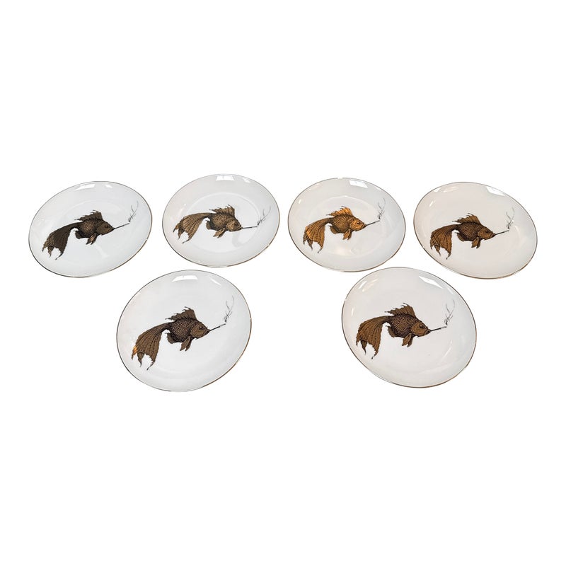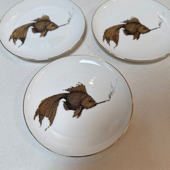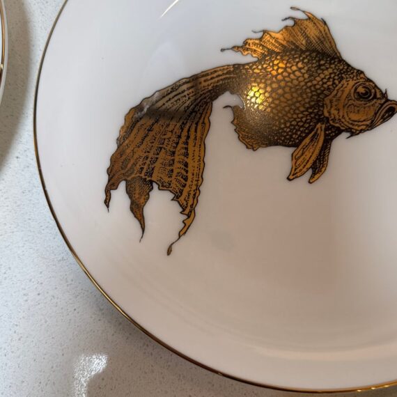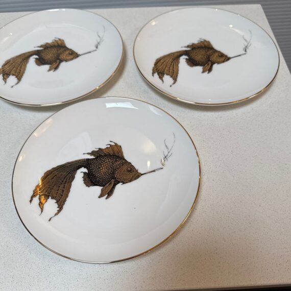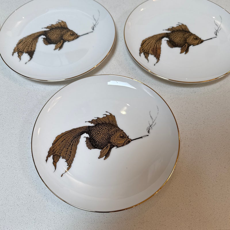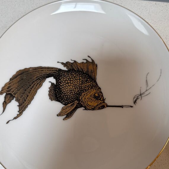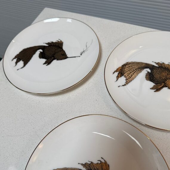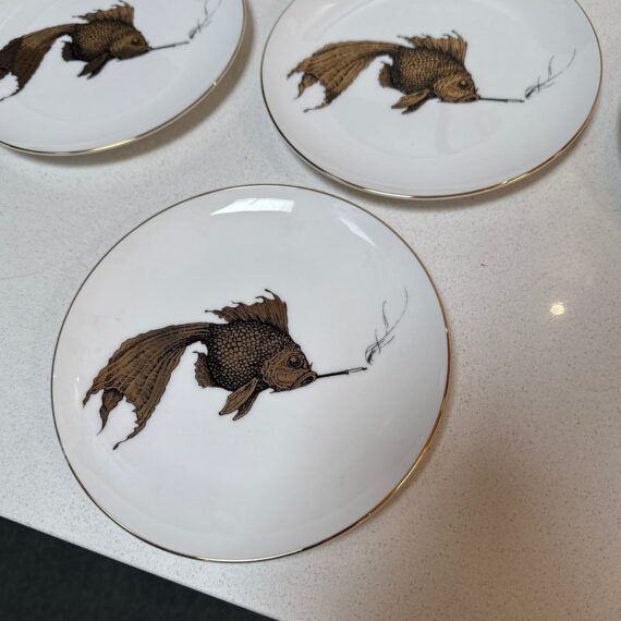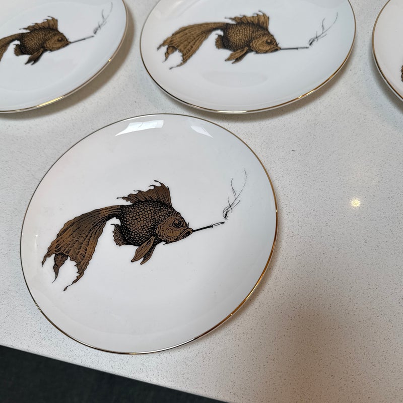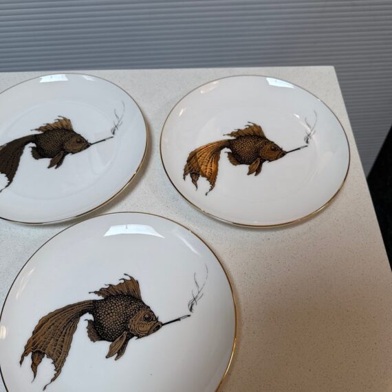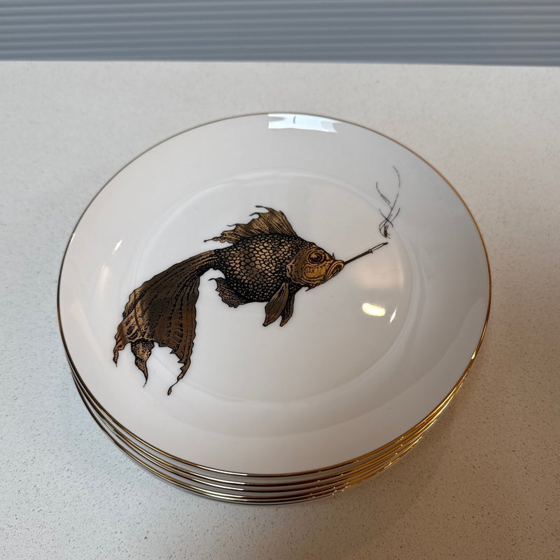 Design Plus Gallery presents a Set of Six “Smokey Fish” Plates by Rory Dobner. Designed and crafted in England, these fine bone china plates are hand decorated & hand edged in 22 carat gold. An intricate Ink Illustration by the artist will certainly attract attention when serving guests. Little wear; condition is good.