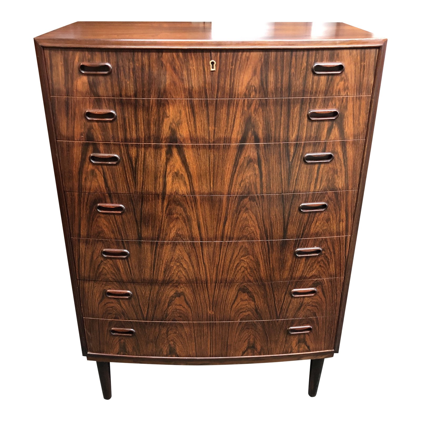 Design Plus Gallery presents a mid century dresser by PMJ Viby J. Letting the rich rosewood woodgrain be the star, the simple silhouette is a great scale for bedroom, guest room or dressing room. Carved finger pulls. Made in Denmark.