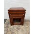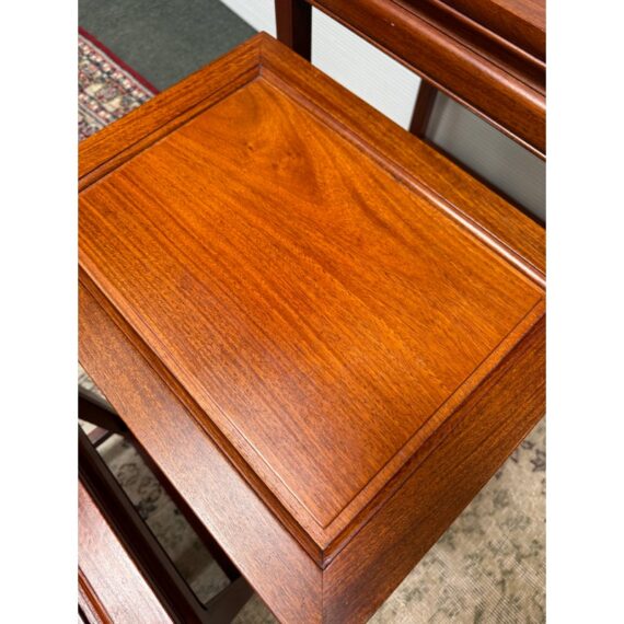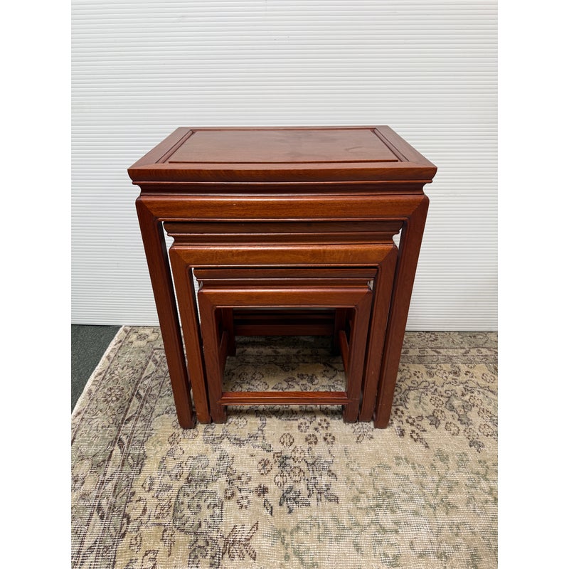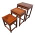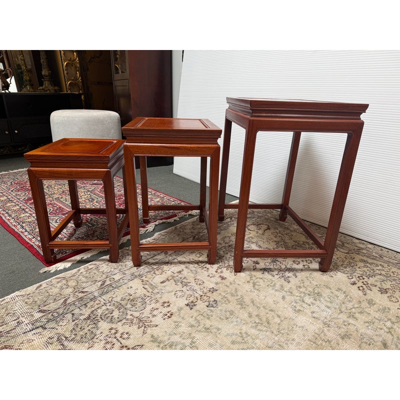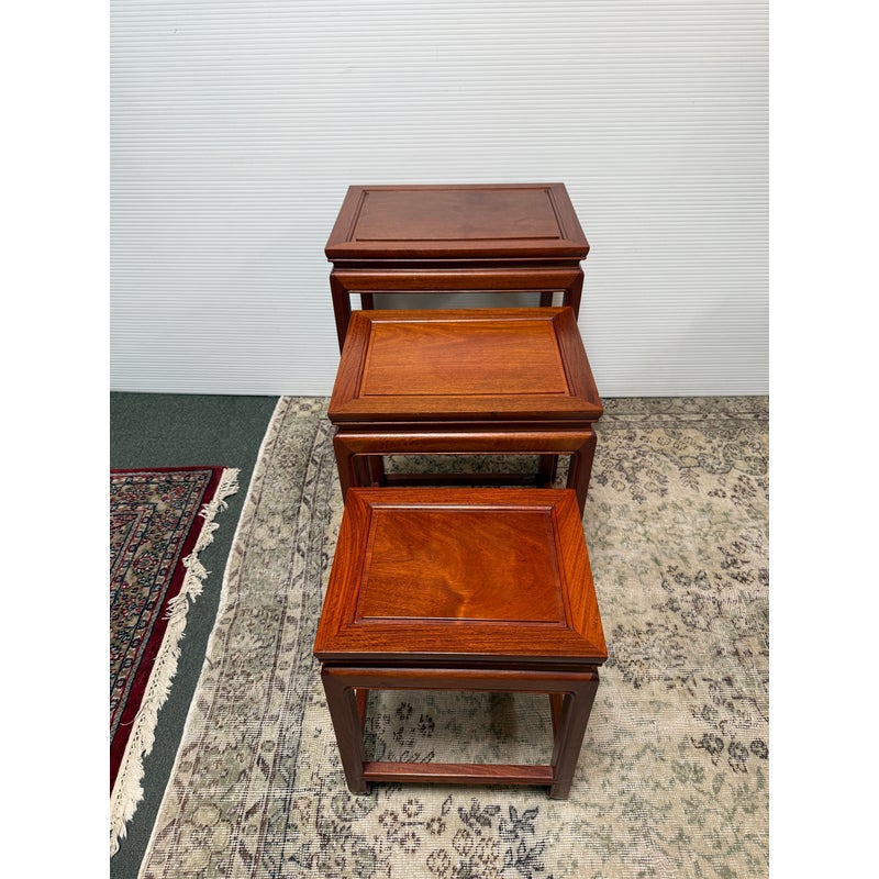 Design Plus Gallery presents a Set of Three Nesting Tables. The table are of vintage age and constructed from solid rosewood. They have a loverly auburn tone with the slight hint of red that makes them valuable and admirable. Rosewood is highly valued for its exceptional durability, dense composition, and resonant, warm tonal qualities. Its natural oily, hard nature resists wear and rot, providing longevity and a smooth, comfortable, and aesthetically pleasing surface. The tables are all the same style but with different sizes that graduate smoothly into one another, making them practical in homes for their minimal footprint when not in use. They are in good overall condition with sun exposure present.