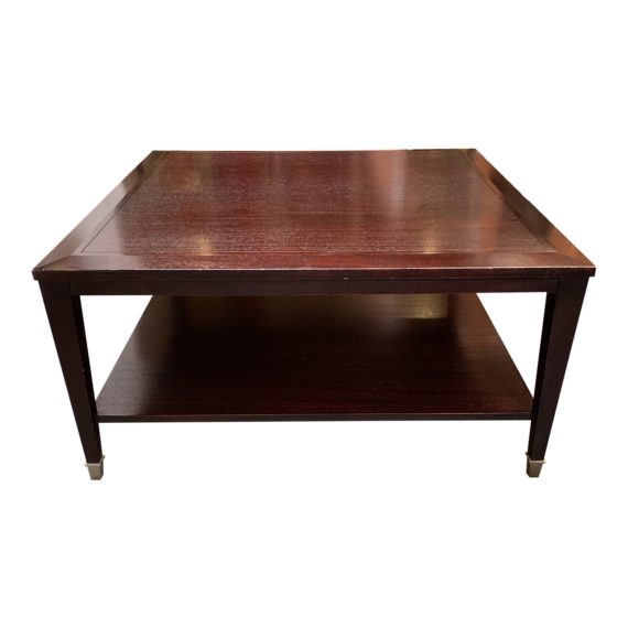 Design Plus gallery presents a Rosewood Stain + Polished Chrome Cap Coffee Table. Beveled edges adds a softness to this coffee table. Visible wear on the finish through out. Comes with a shelf on the bottom for open storage.