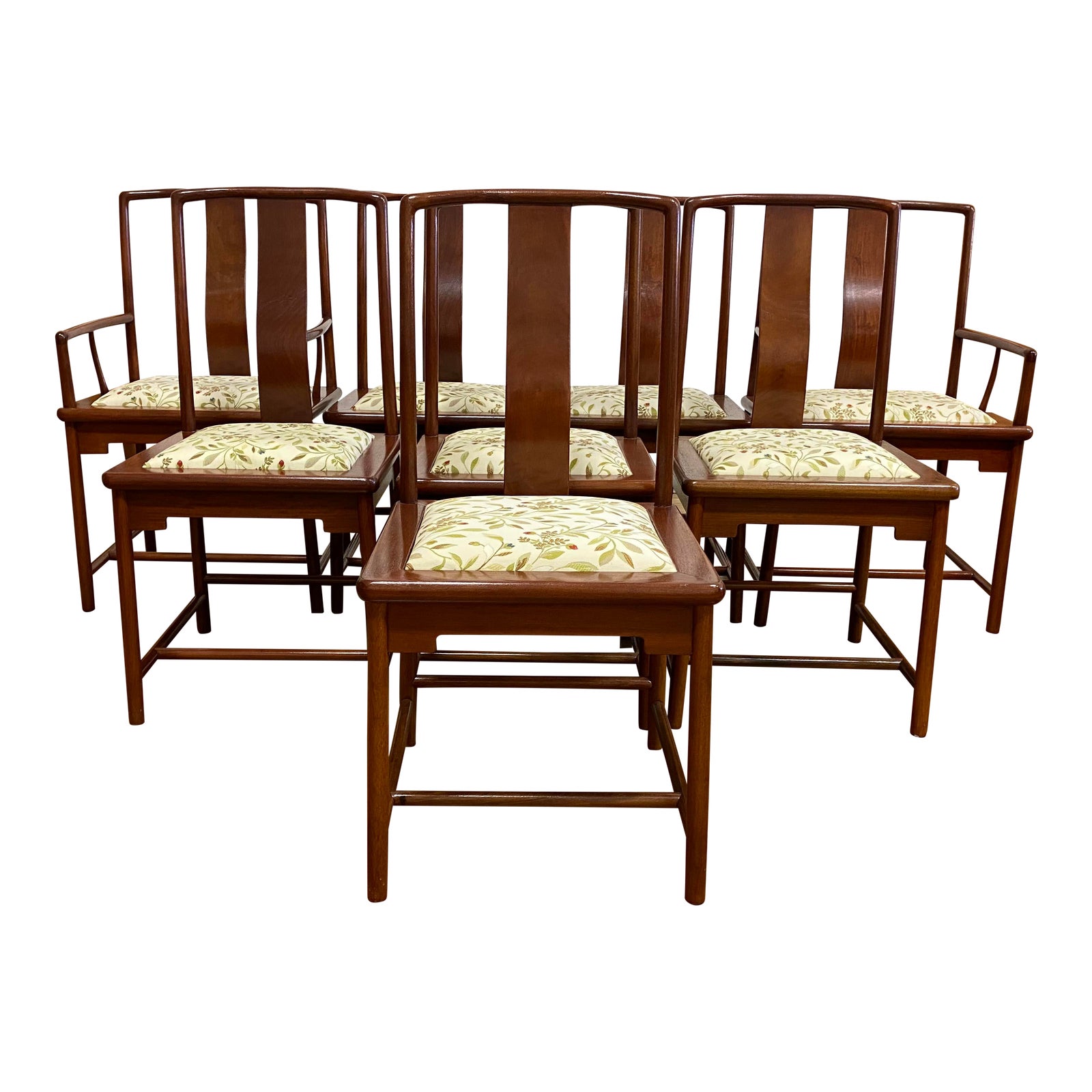 Design Plus Gallery presents a Set of Eight Late 20th-Century Rosewood Upholstered Dining Chairs. Solid rosewood is finished with a rich Chestnut stain and satin lacquer. Trestle base and high back + lumbar support offers support and comfort with an upholstered inset seat. Fabric is a creamy floral pattern with green and red. Two of the chairs come with arms. Minor wear on surfaces.