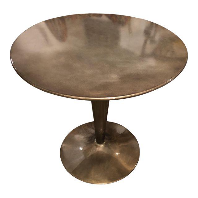 Design Plus Gallery presents a Metal cafe table. The little table has a pedestal and a round Metal top. The table is perfect for two but you could squeeze four if you had to.