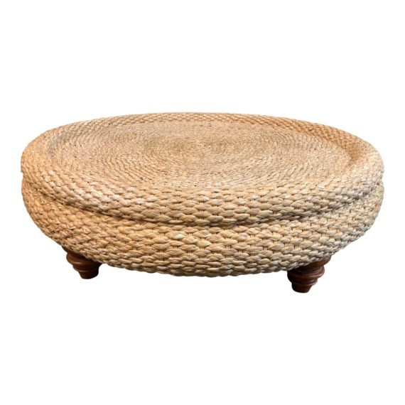 Design Plus gallery presents a Contemporary Round Seagrass Coffee Table. Rounded form sits atop turned wood legs in a chestnut stain. Seagrass has a substantial rounded outer lip to contain objects placed on the surface. Seagrass is a neutral toned sisal weaved in a thick + robust fashion. Little evidence of wear.