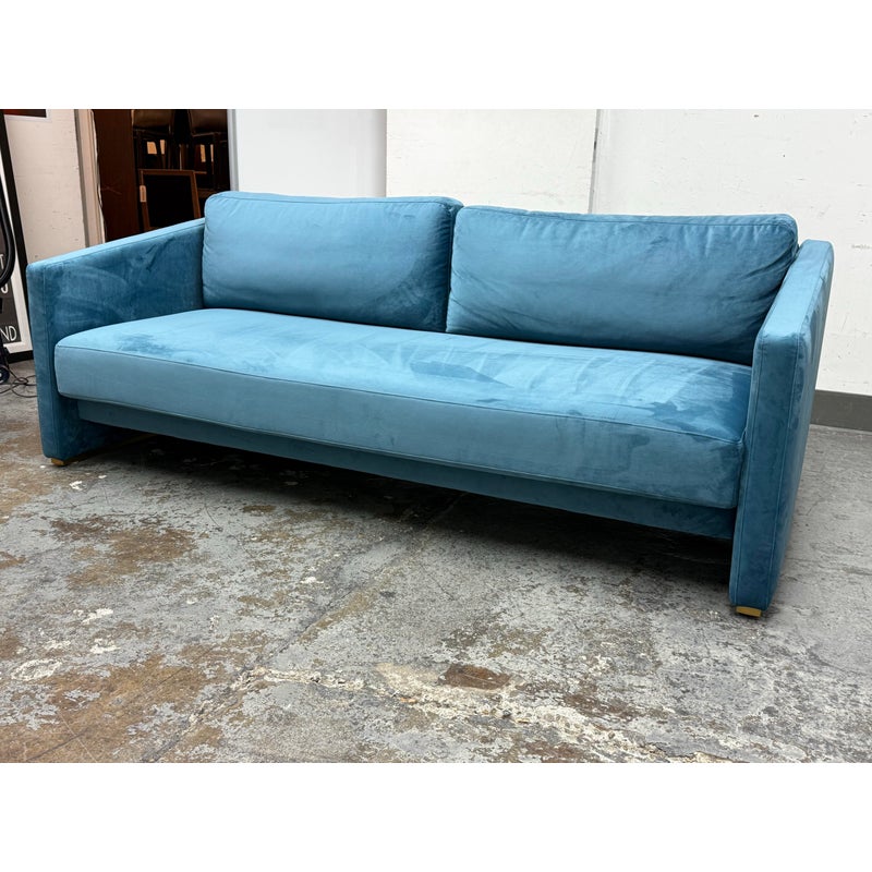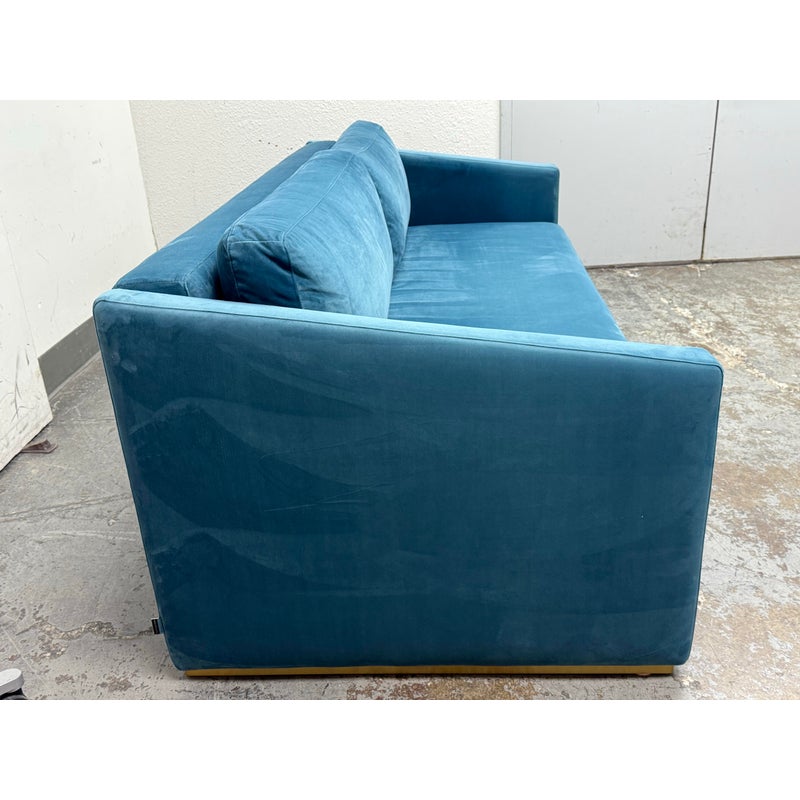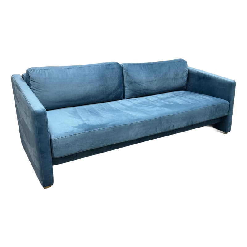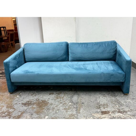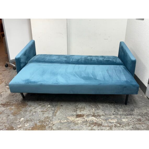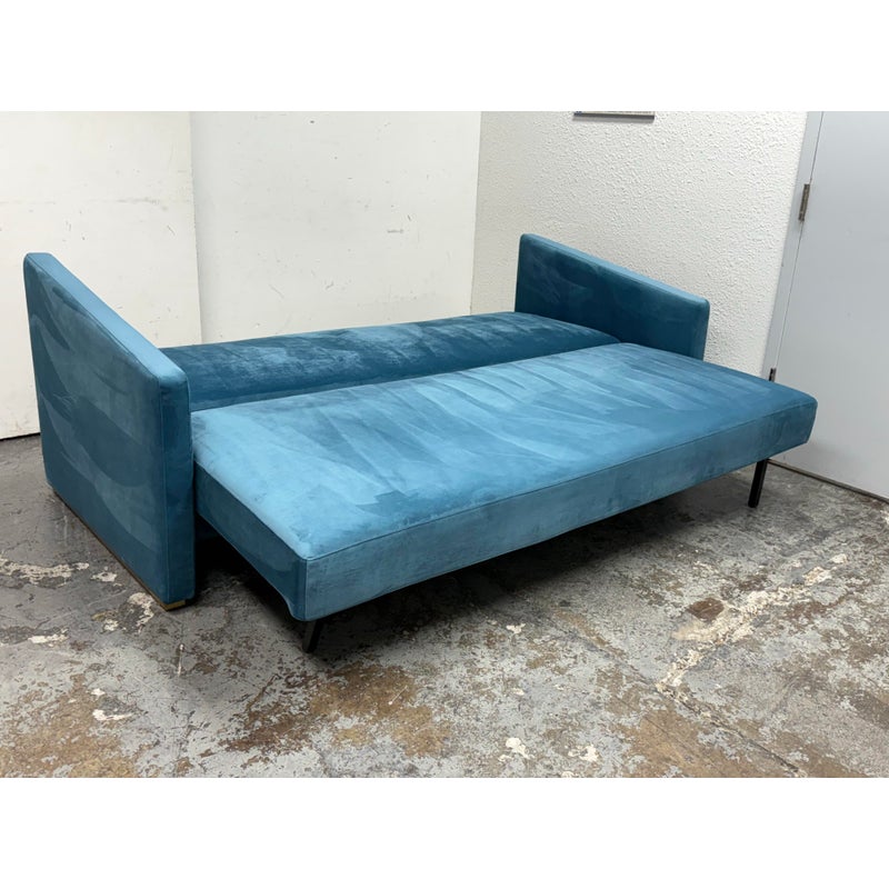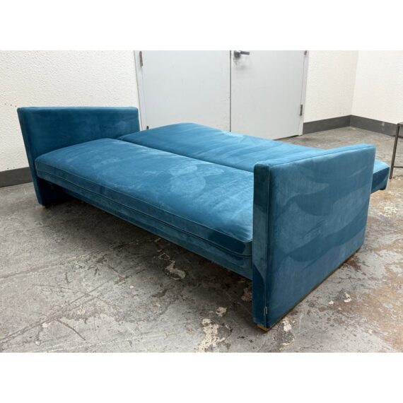 Design Plus Gallery presents the Bristol Sleep Futon in Solstice from Rove Concepts. Modern with Mid Century design appeal this apartment or office size sofa does overtime as converting bed that easily transitions into a comfortable sleep space. Soft plush teal green velvet wraps around the soft padded foam pad that is built upon its solid kiln wood. There is minor surface wear to the fabric, as shown, with discoloration but overall in good condition for its usage.