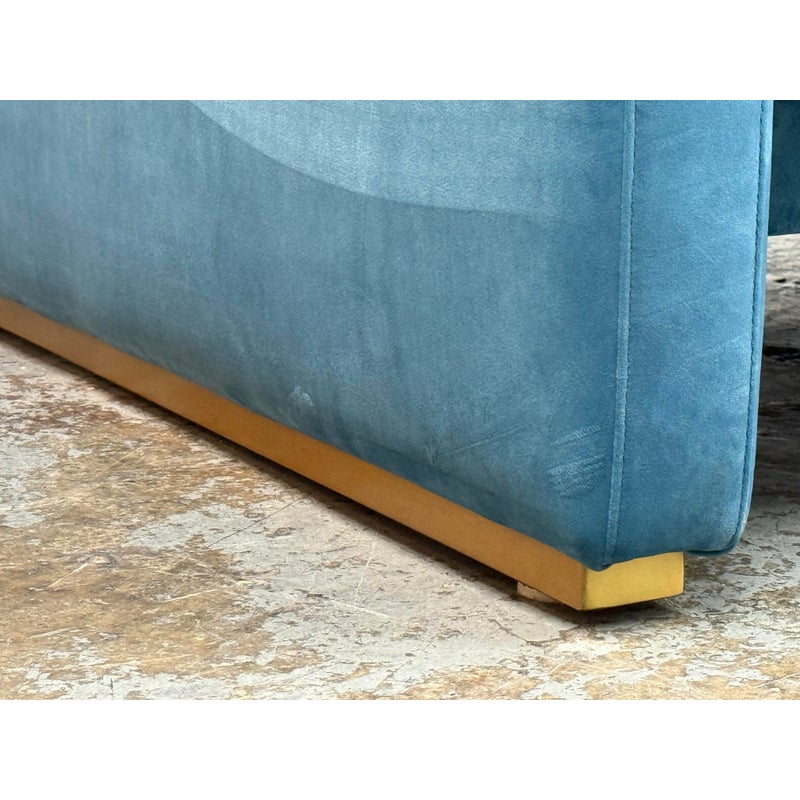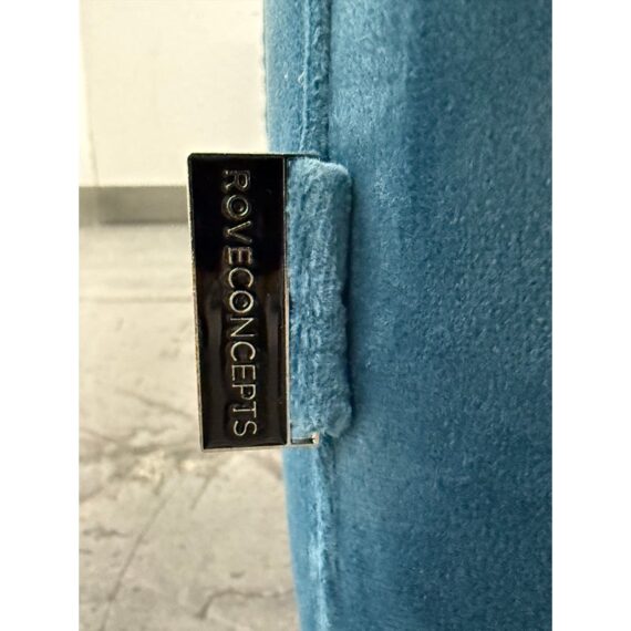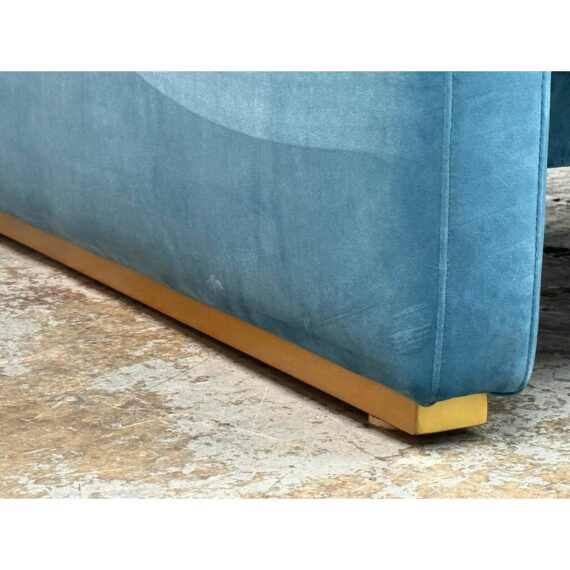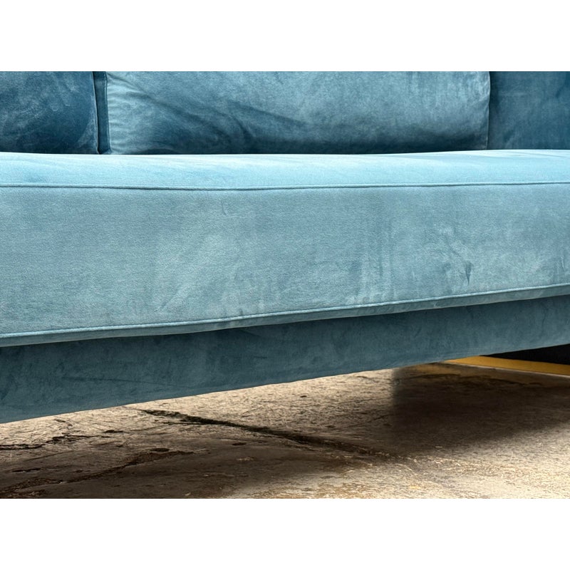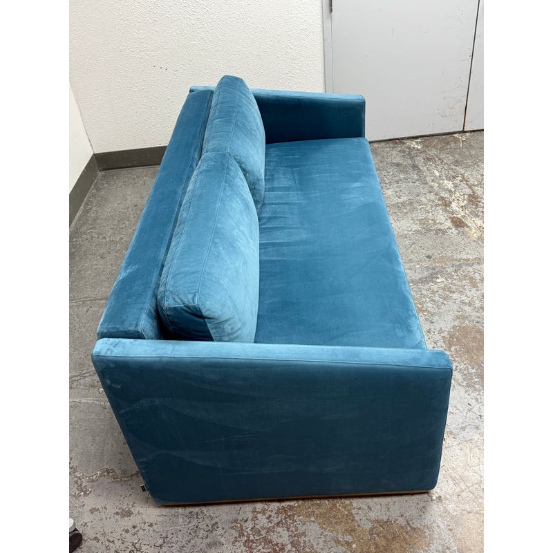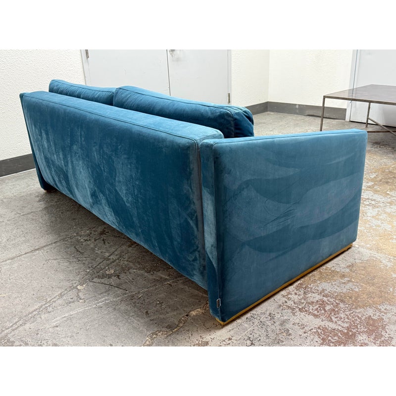 Design Plus Gallery presents the Bristol Sleep Futon in Solstice from Rove Concepts. Modern with Mid Century design appeal this apartment or office size sofa does overtime as converting bed that easily transitions into a comfortable sleep space. Soft plush teal green velvet wraps around the soft padded foam pad that is built upon its solid kiln wood. There is minor surface wear to the fabric, as shown, with discoloration but overall in good condition for its usage.