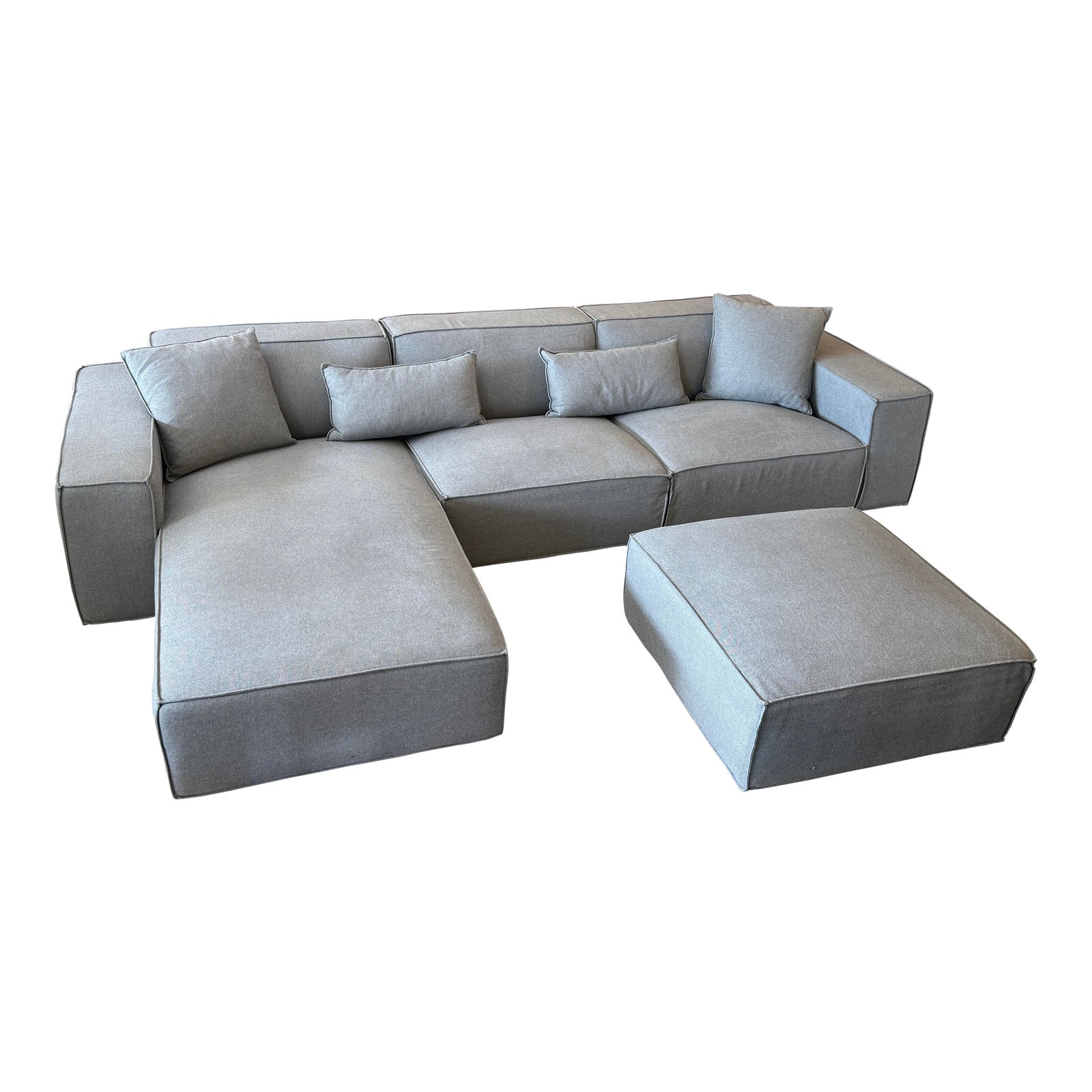 Design Plus Gallery presents The Porter Sectional + Ottoman by Rove Concepts. The structured sofa with boxy flare has a low-set profile crafted on a Kiln-dried hardwood frame with doweled joints and reinforced corner blocks and sinuous spring support. Square arm rests are profiled like a side table, while an elevated back rants perfectly for support. High-density foam cushioning on sofa and chaise unit, is nicely rounded for comfort and style. Detailed pipe stitching around the edges of the performance upholstery, finishes the modern design.for even more flexibility. Light surface wear; condition is consistent with age and use.