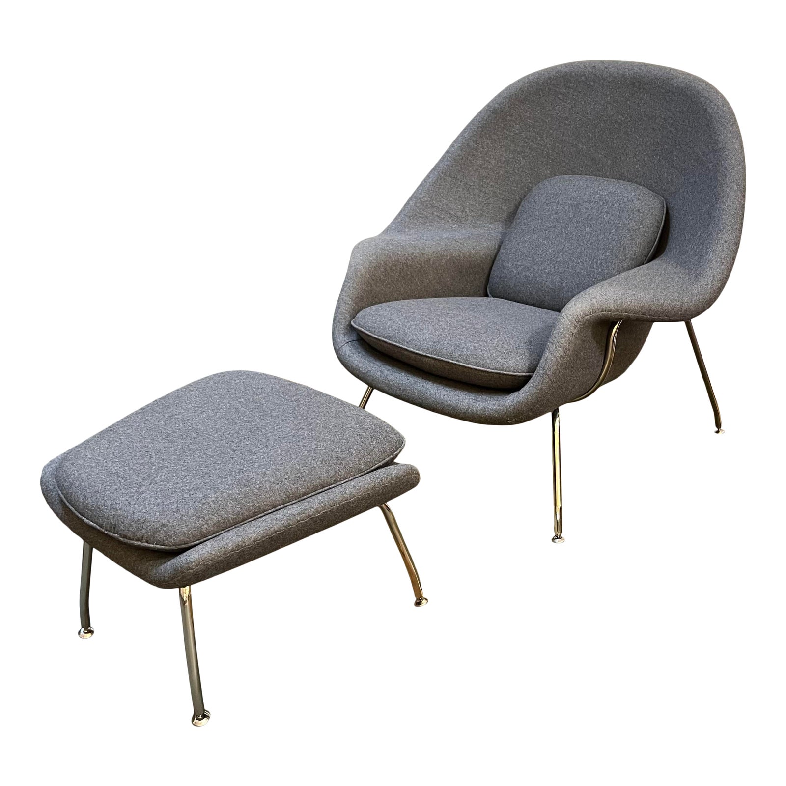 Design Plus Gallery presents the Rove Concepts Womb Chair + Ottoman. The chair and ottoman shells are made of molded fiberglass and padded with foam. The legs are stainless steel and feature foot caps to prevent floor scratches. Wear is consistent with use; chair and ottoman are in good condition. Upholstered with premium wool.