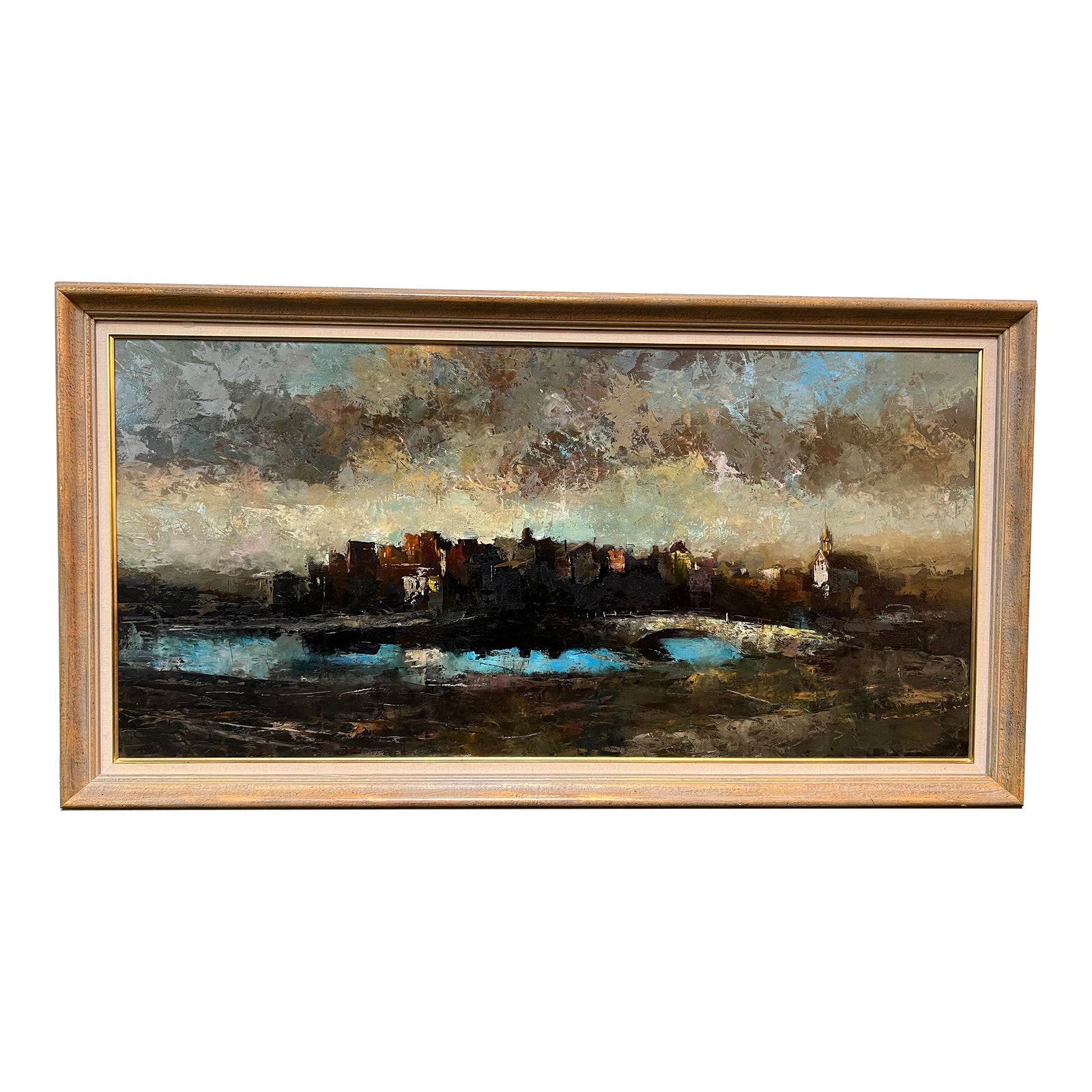 Design Plus Gallery presents “Small Town” an original painting by Russell Frost (American, 1927-1996), Washington. Purchased in the late 50’s, the intense riverside painting shows a moody sky and overcast town reflected in the nearby waterway. Lively brushstrokes draw the viewer into the scene. Linen mat with simple cerused frame. Good condition.