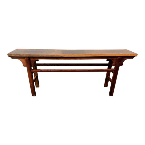 Design Plus Gallery presents a Vintage Chinese Farm Console Table. The restoration of this antique farm table is kept to minimum intentionally. Well-aged elm with some brown remaining shows natural warm wood color + texture. The straight legs are mitered to the top. In good condition, wear is visible on surface and legs but.