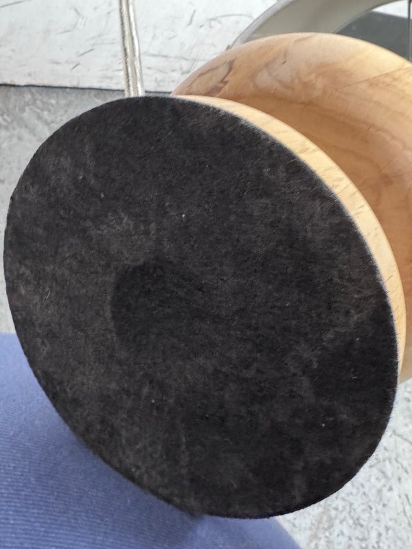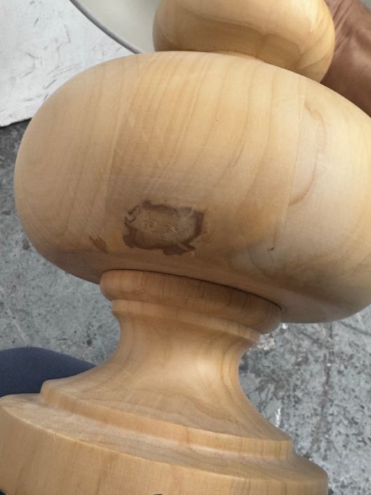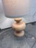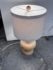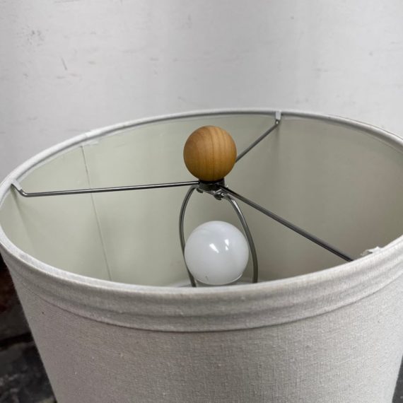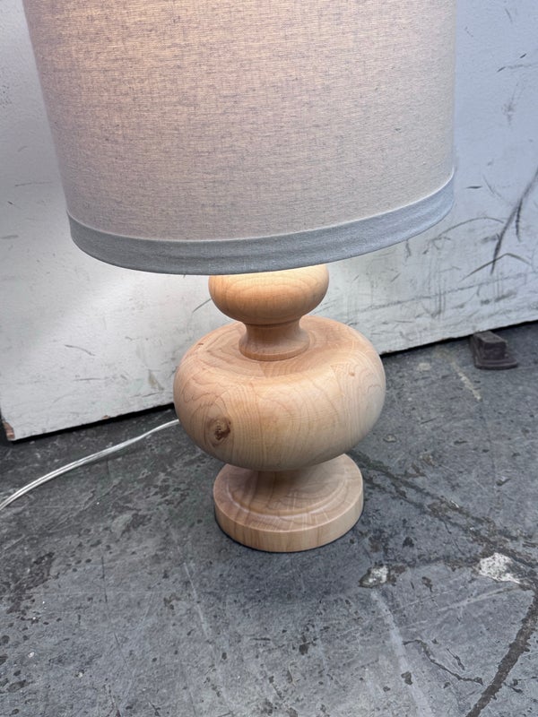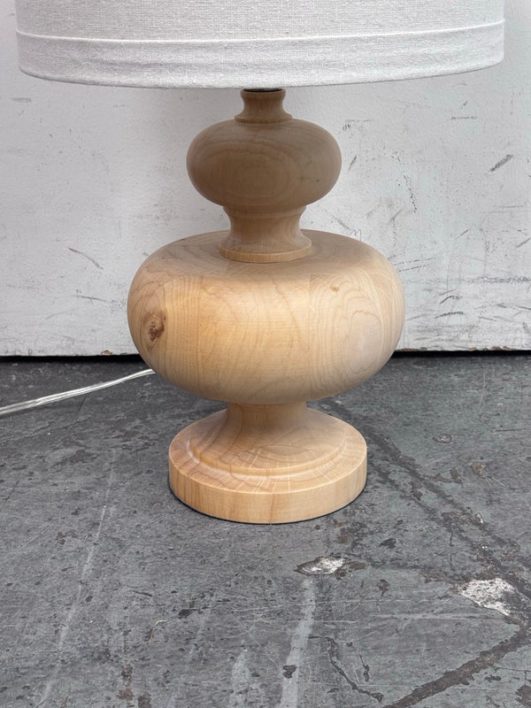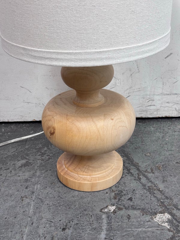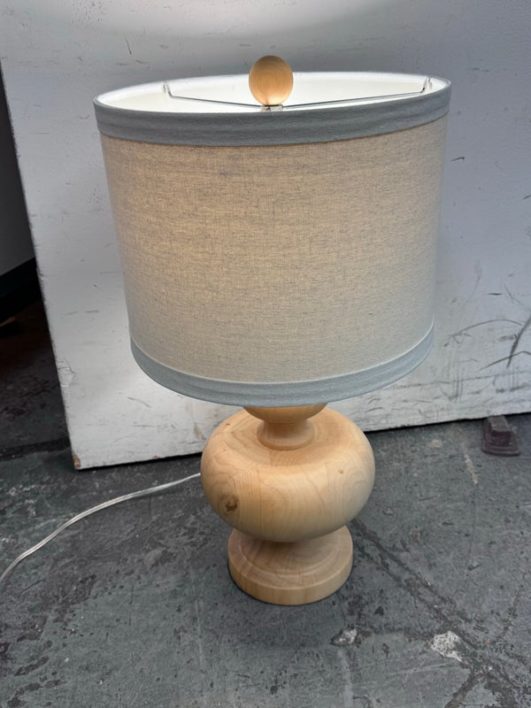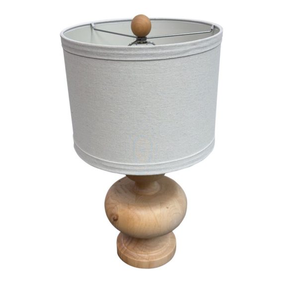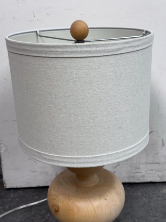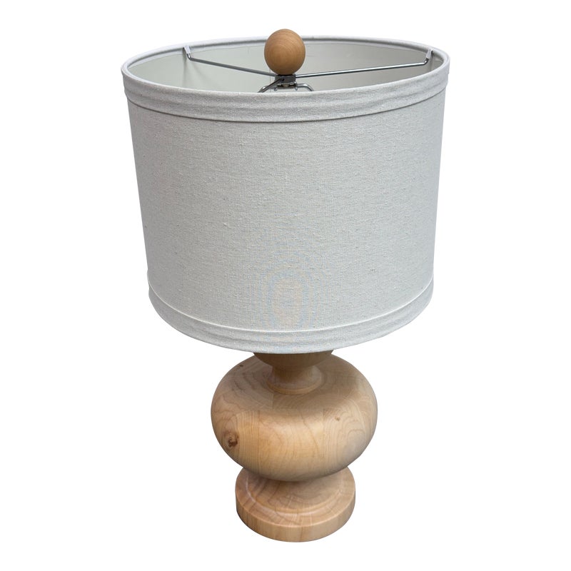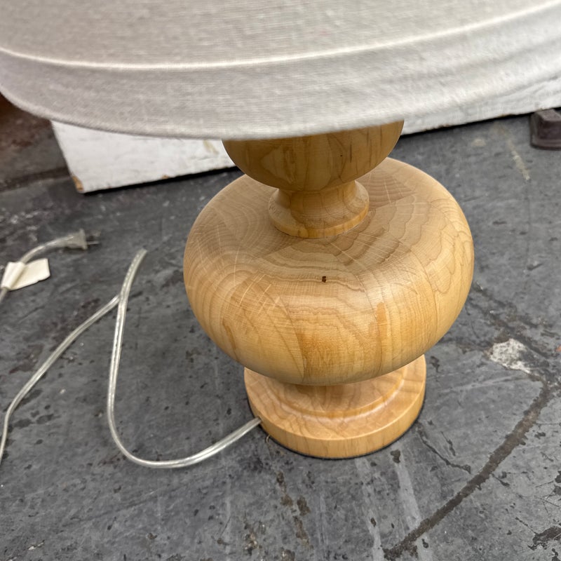 Design Plus Gallery presents a Nice, Neutral Table Lamp. The wooden table lamp has a turned craftsman style with a smooth, light oak wood finish. Matching top finial of light wood sphere to sturdy the linen drum shade. Is in good condition with minimal surface wear.