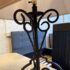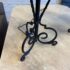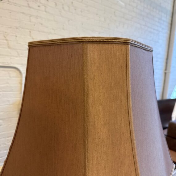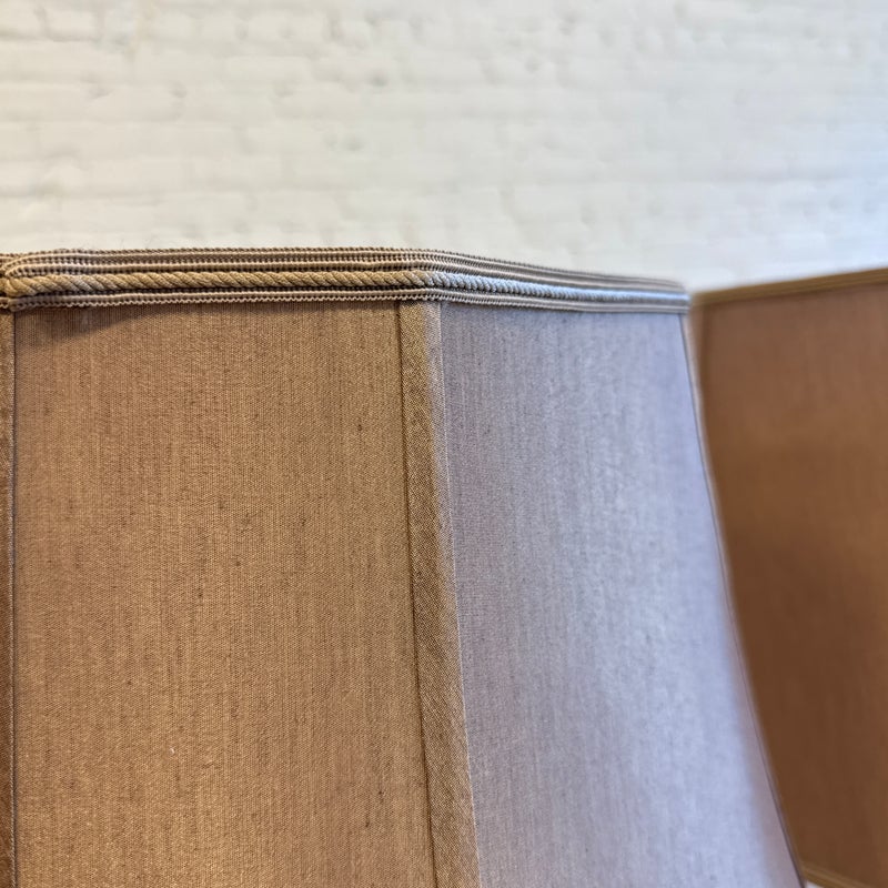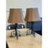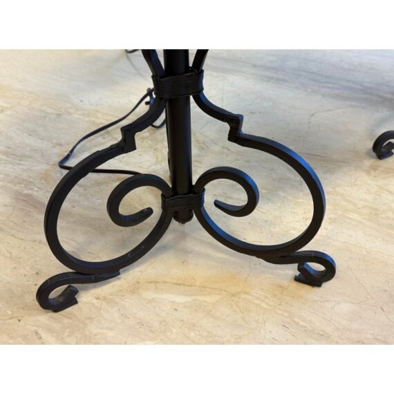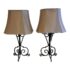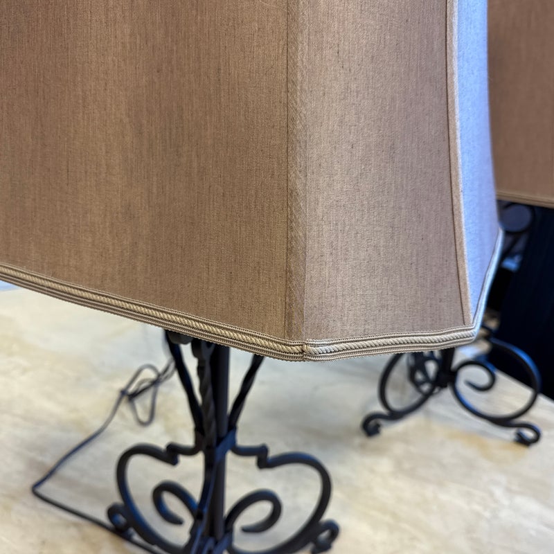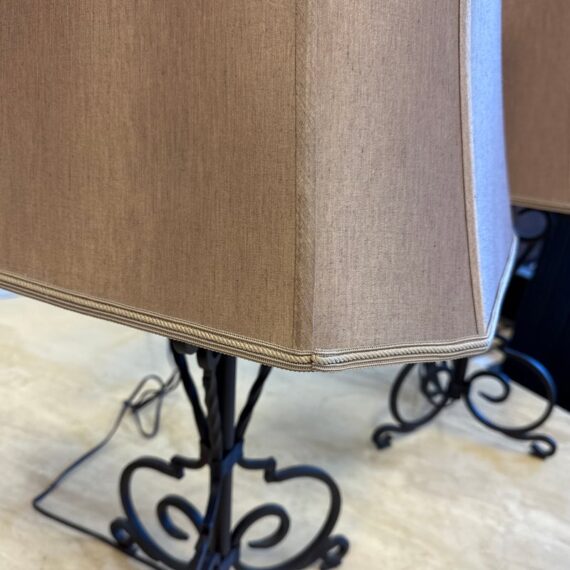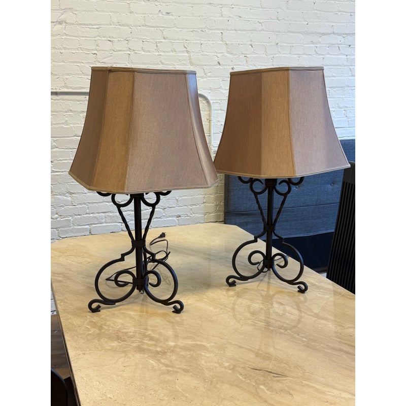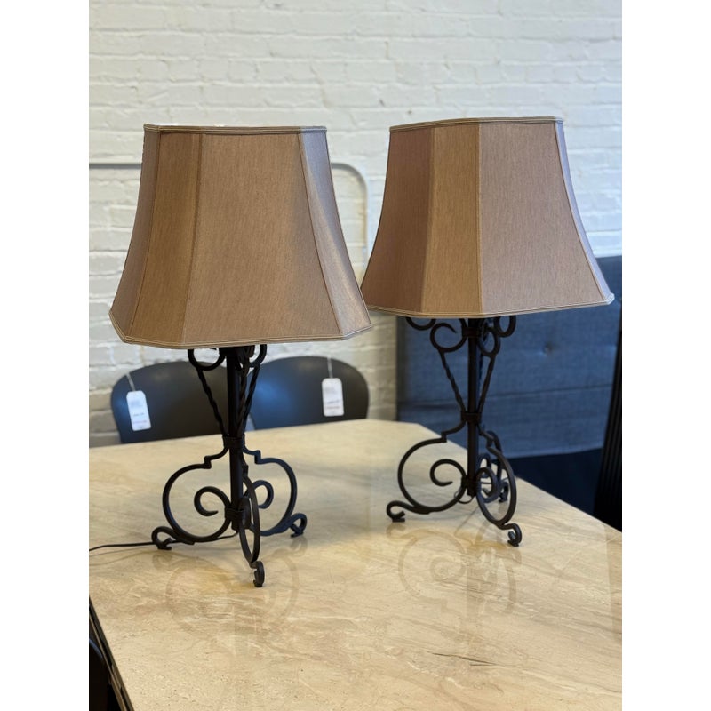 Design Plus Gallery presents a Pair of Table Lamps with a Rustic European Style. The two are made from forged iron like material with bent pieces that have identical design elements. They have tan silk shades that perfectly balance their composition + size, elevating them to a more sophisticated presence. They are in good condition with minimal wear.