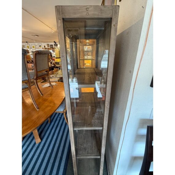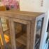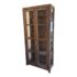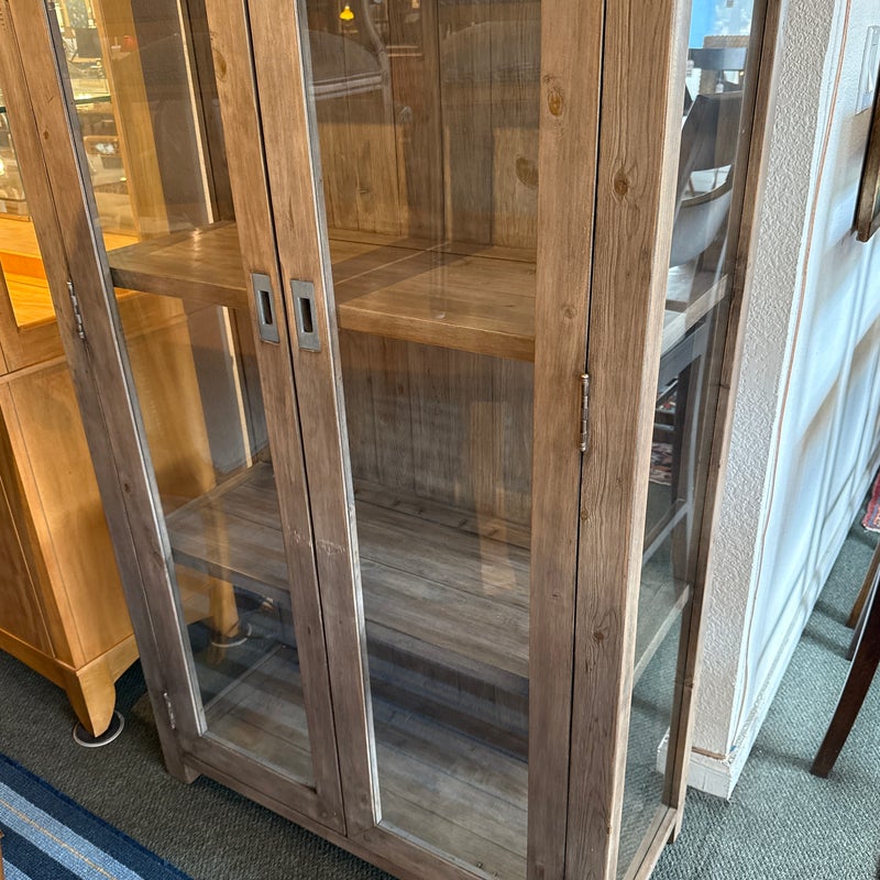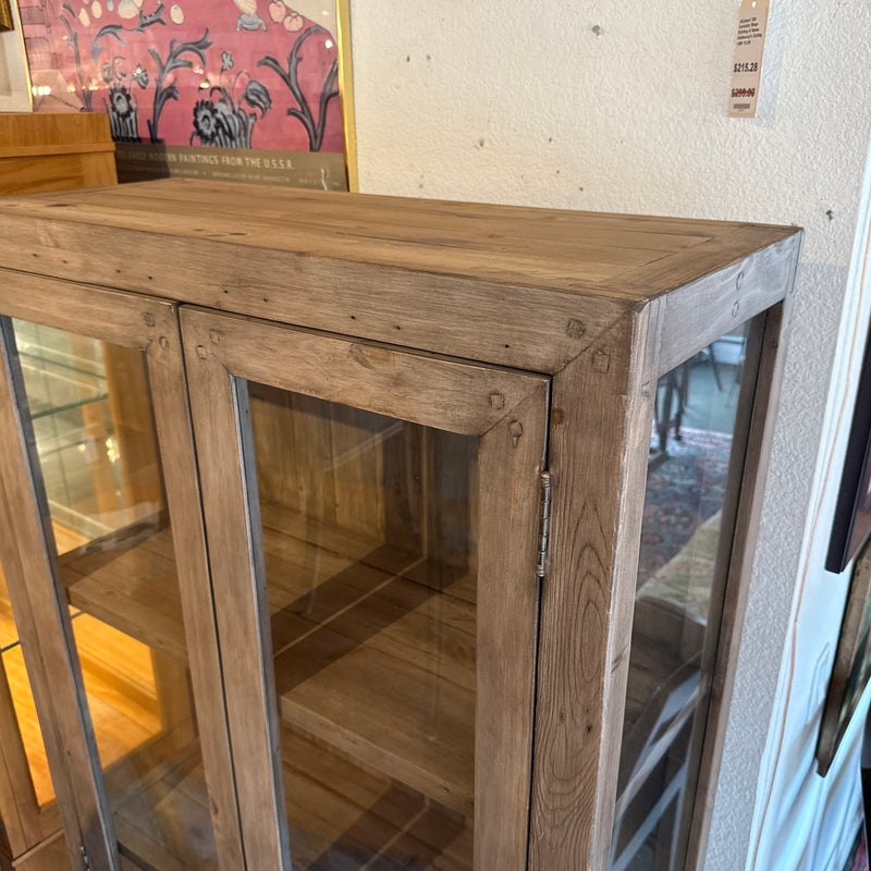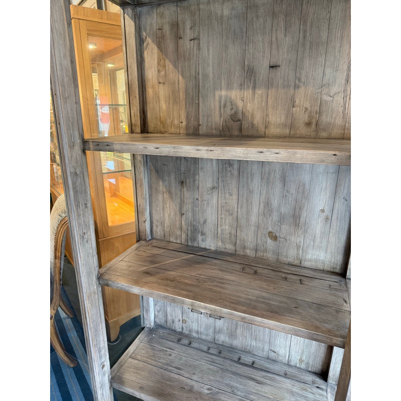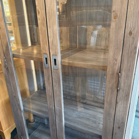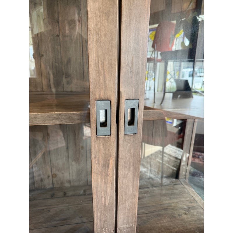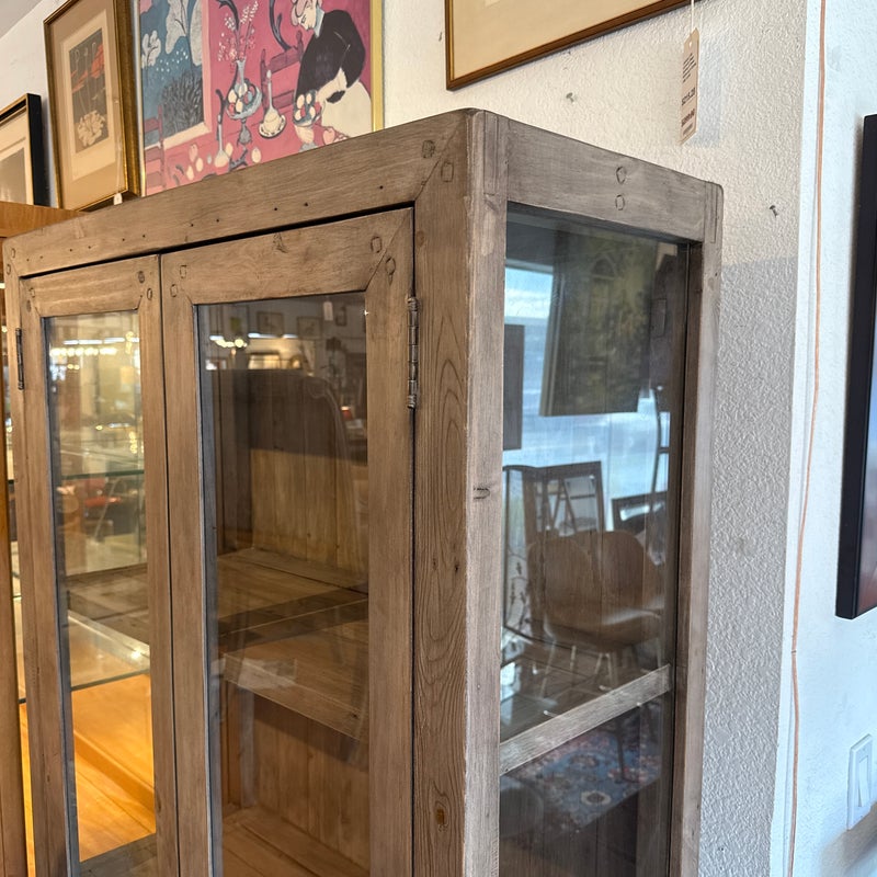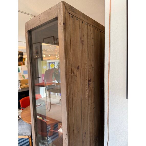 Design Plus Gallery presents a Reclaimed Wood + Glass Bookshelf. The style is similar to Restoration Hardware with its rustic European design style of easy going and quiet luxury. The frame is made from found wood that is given a Mink stain. There are glass panels on the side and on doors. The doors open to three wooden shelves and a paneled back wall. It is in good condition with wear that is consistent with usage.