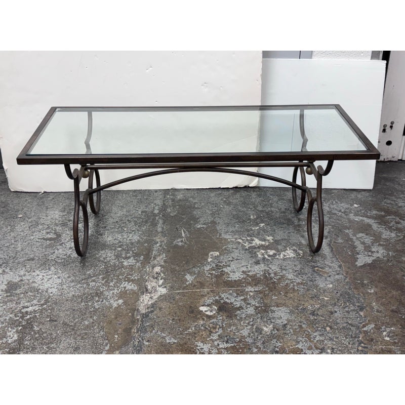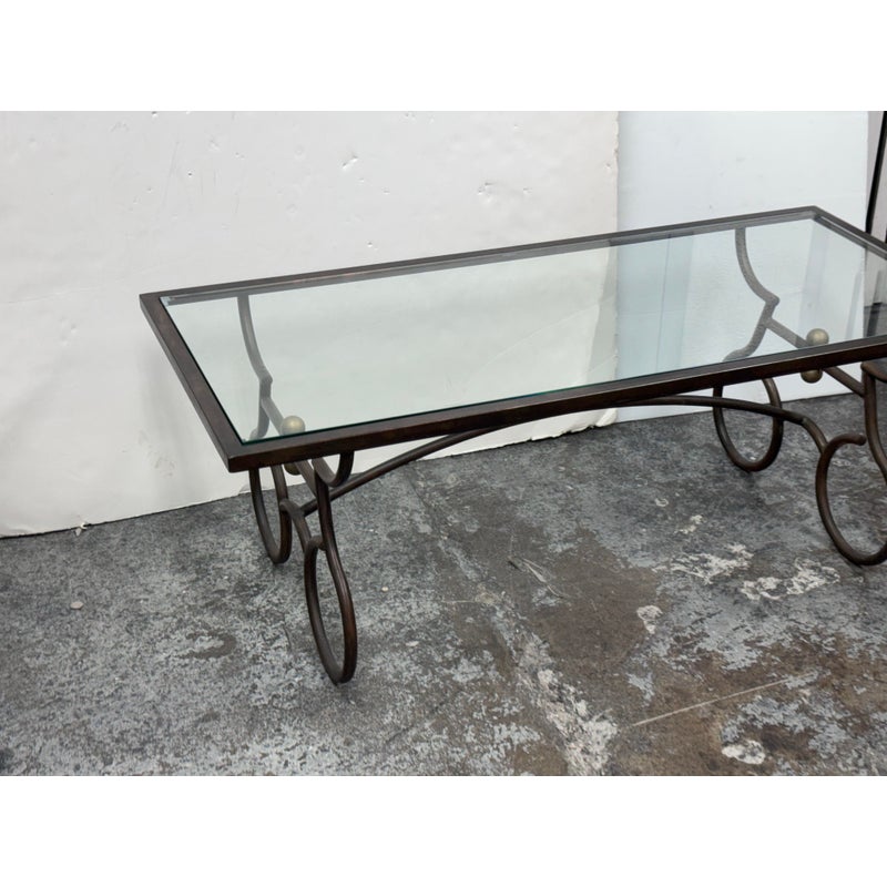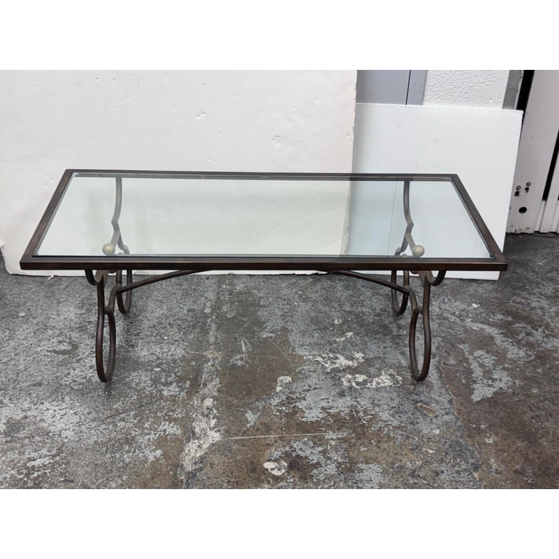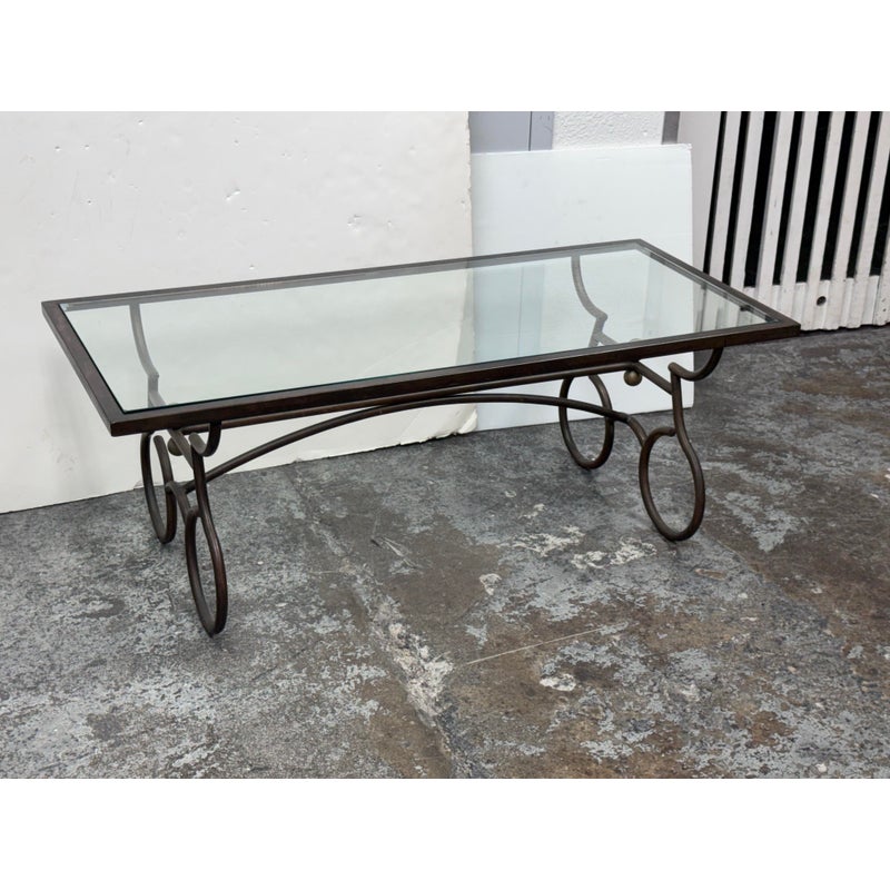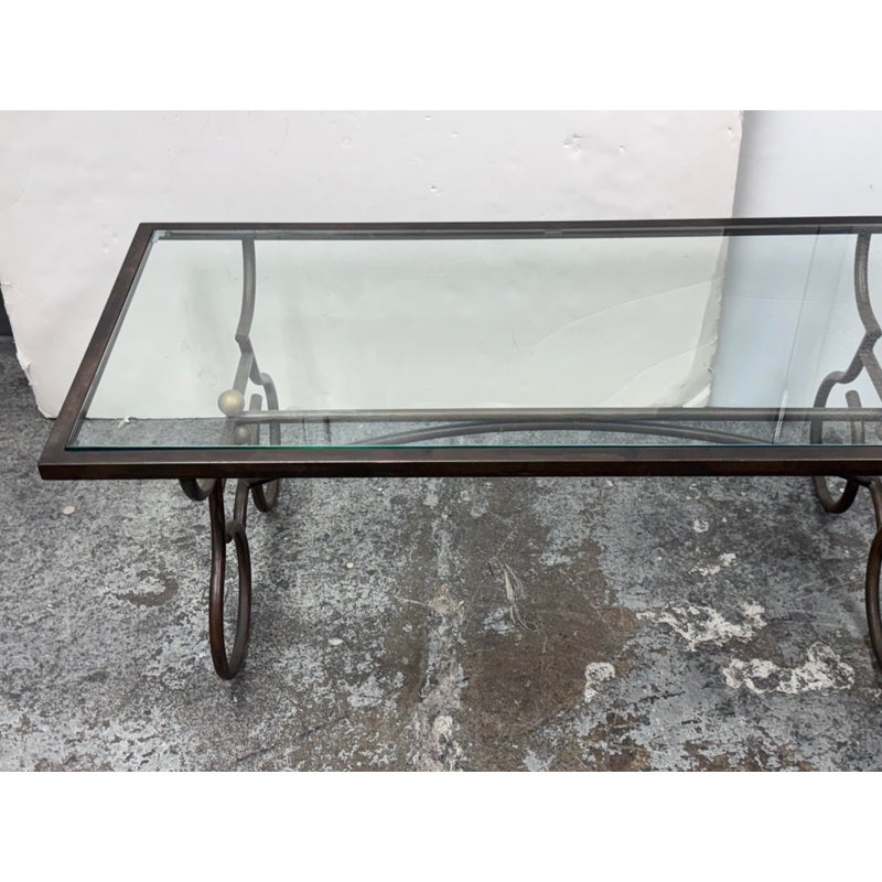 Design Plus Gallery presents a Wrought Iron Coffee in a Rustic European Style. The table base is heavy and sculpted with delightful elements that will warm your heart and home. The circular legs are unique and hand forged with precision. The entire surface of the tempered glass is inset to its iron frame, another attribution of talent to the unknown maker of this piece. It is in good condition with many more decades of use to it. Visible wear is present but overall in good condition for its usage.