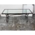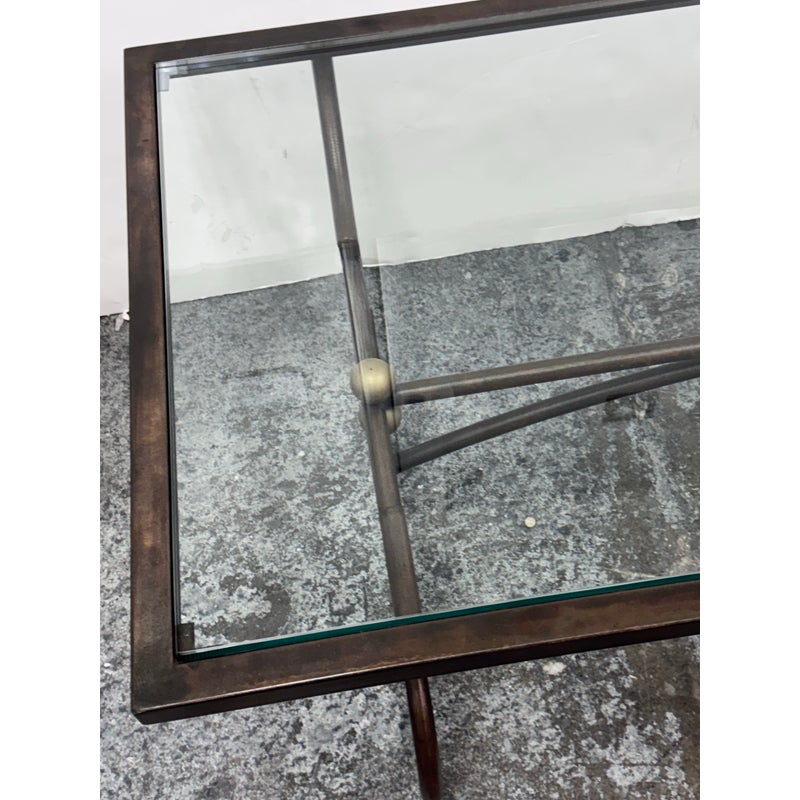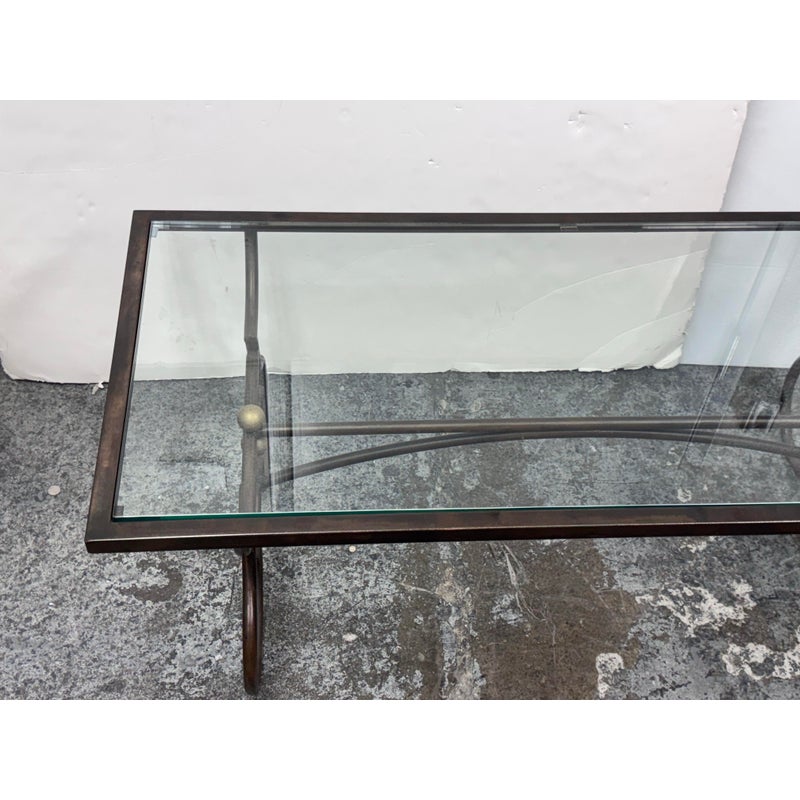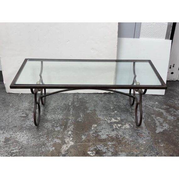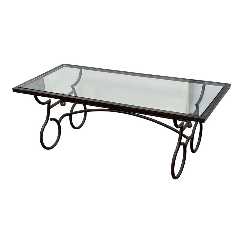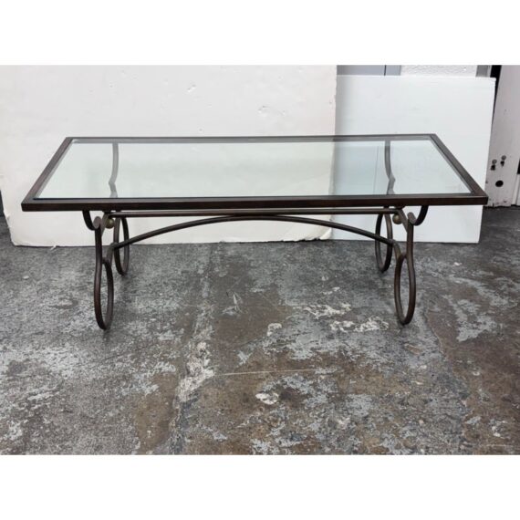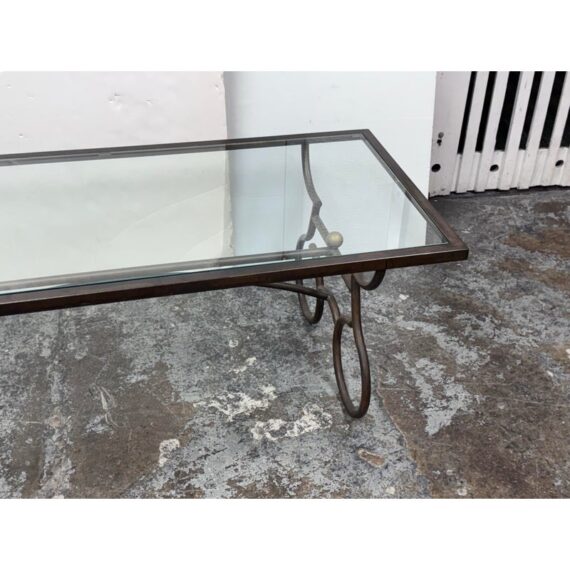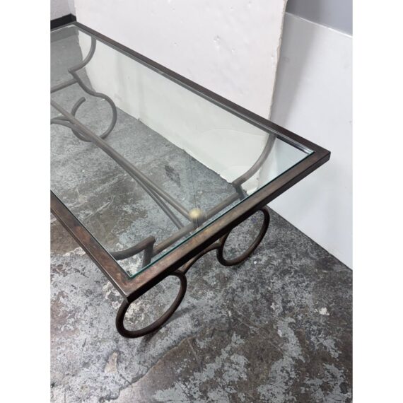 Design Plus Gallery presents a Wrought Iron Coffee in a Rustic European Style. The table base is heavy and sculpted with delightful elements that will warm your heart and home. The circular legs are unique and hand forged with precision. The entire surface of the tempered glass is inset to its iron frame, another attribution of talent to the unknown maker of this piece. It is in good condition with many more decades of use to it. Visible wear is present but overall in good condition for its usage.