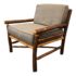 Design Plus Gallery presents a Rustic arm chair. This beautiful chair is comprised large branches which have been stripped of their bark and a caned seat. The seat and back cushions are upholstered in Gray Wool Flannel. The chair has definite Rustic cabin esthetic.