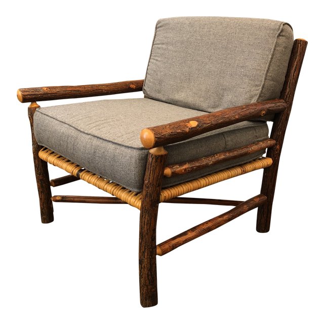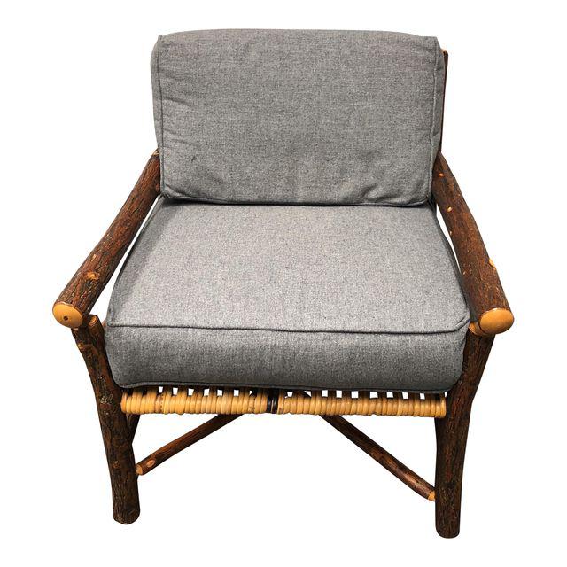 Old Hickory Hand Carved Wood Armchair With Gray Cushions