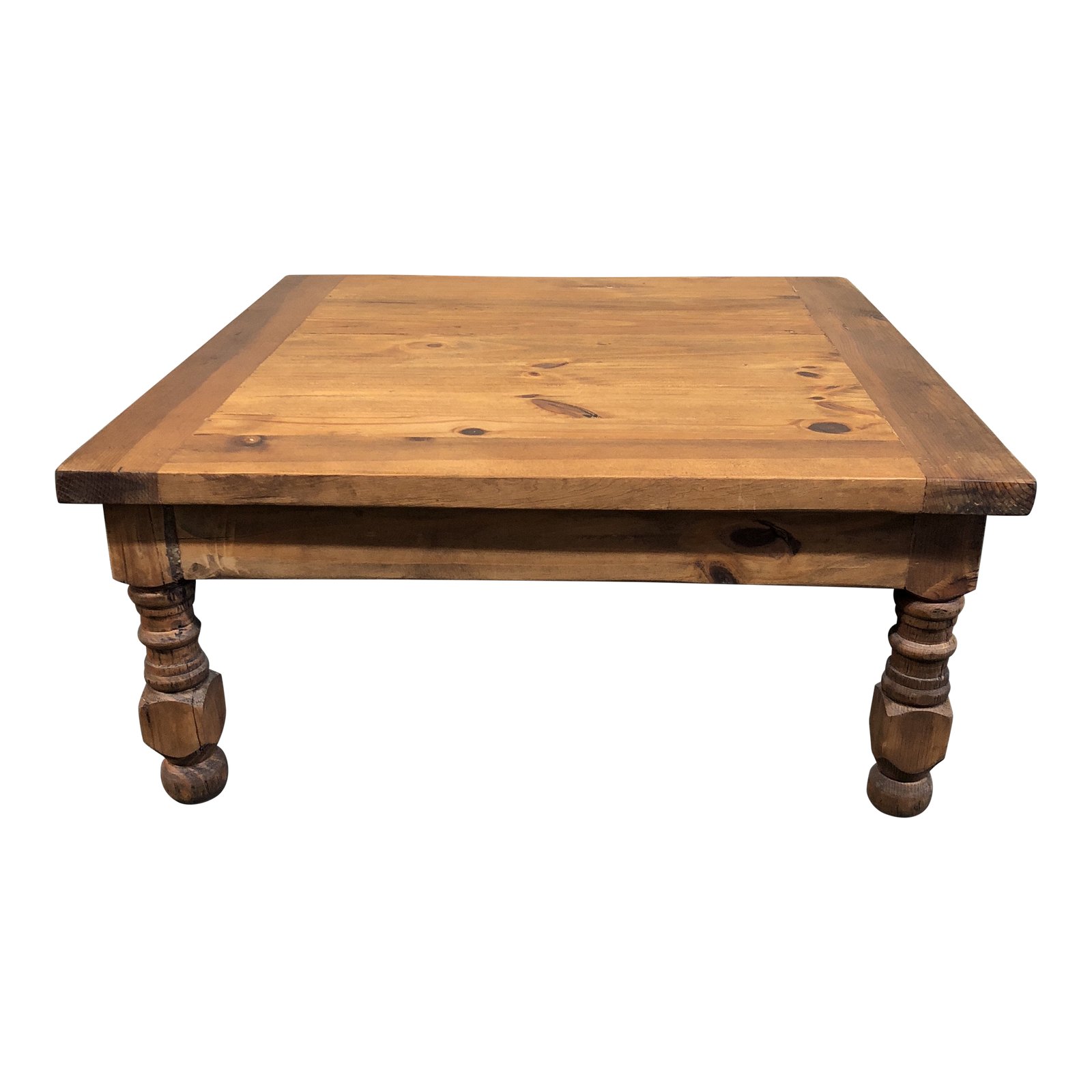Design Plus Gallery presents a solid oak coffee table. Sturdy, turned legs support this substantial coffee table. Two tone inlayed woo frames the top of the table, a composite of individual boards each with their own wood grain, knots, and original luster. Hecho en Mexico.