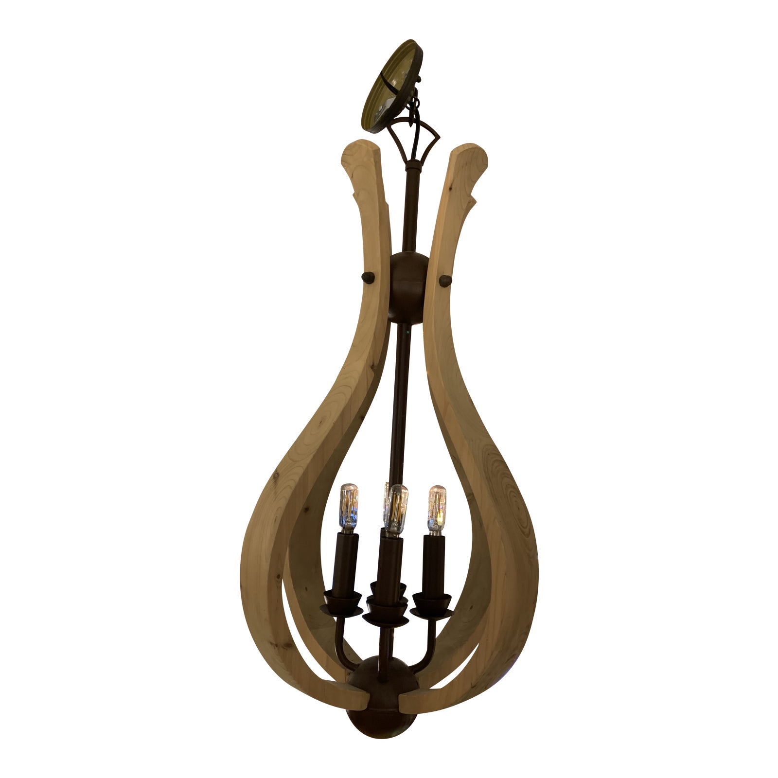 Design Plus Gallery presents a Rustic Style 4-Light Reclaimed + Metal Tear Drop Chandelier. Elegant wood arches extend from the base to the top of the fixture like a lotus. Bronze finished metal supports four lights with a single rod to the canopy. Minor wear.