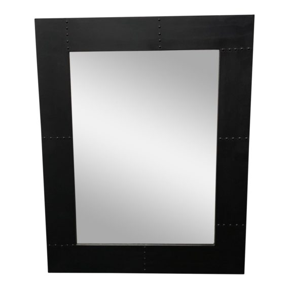 Design Plus Gallery presents a rustic style wall mirror. A wood frame wrapped with a thin metal sheet with decorative rivets. Can hung vertically.