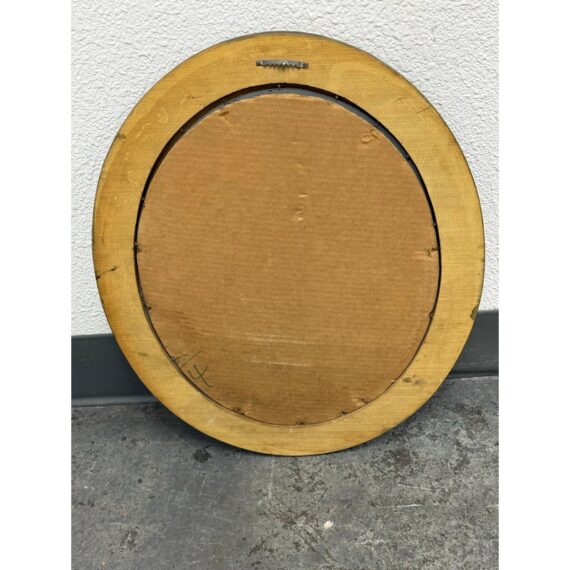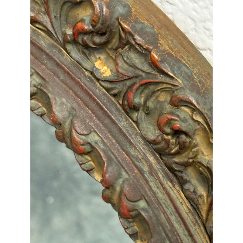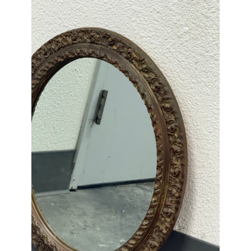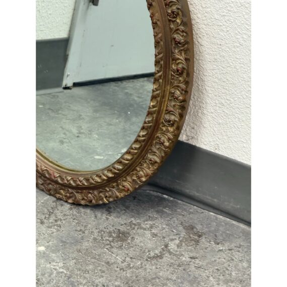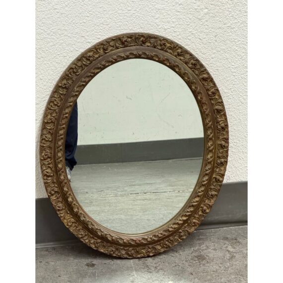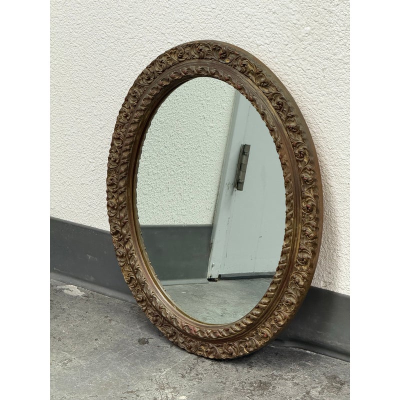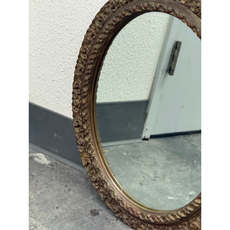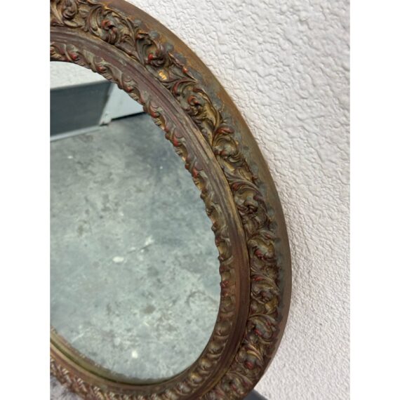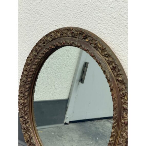 Design Plus Gallery presents an Oblong Wall Mirror with Rustic Swiss European Style. The mirror has two layers of likely hand carved details perfectly balanced around the oval mirrors wood frame. It took a keen eye from a dedicated artist to achieve this decoration. It shows wear from age to the wood from its decades of life but is charming to this day.