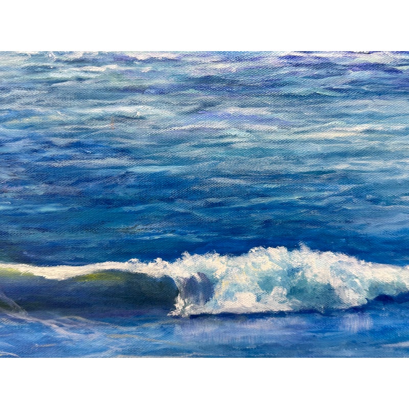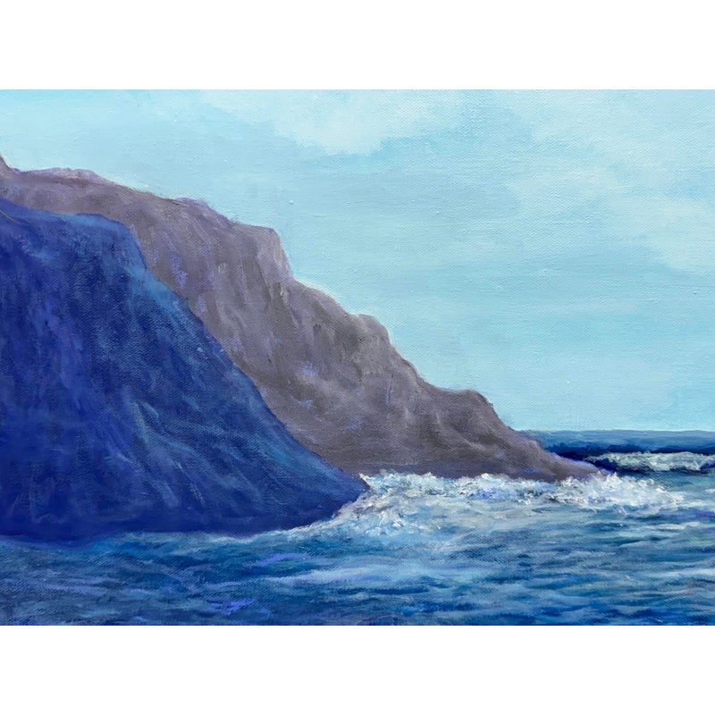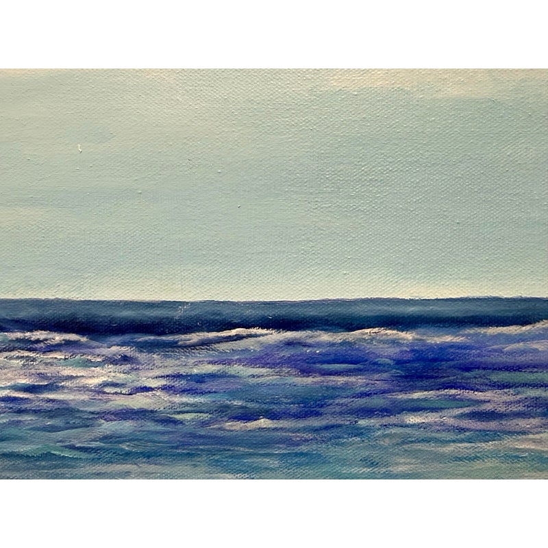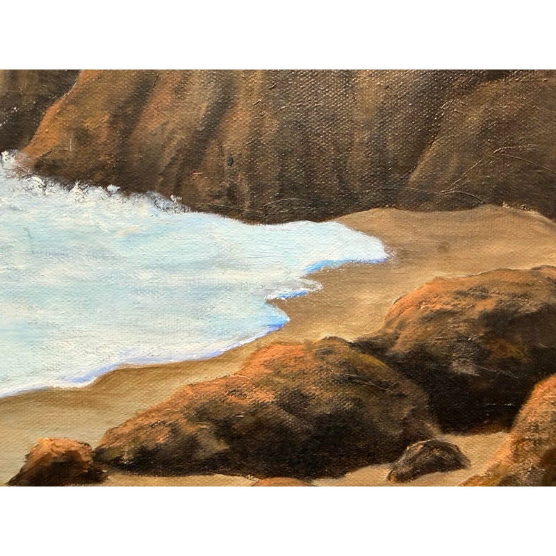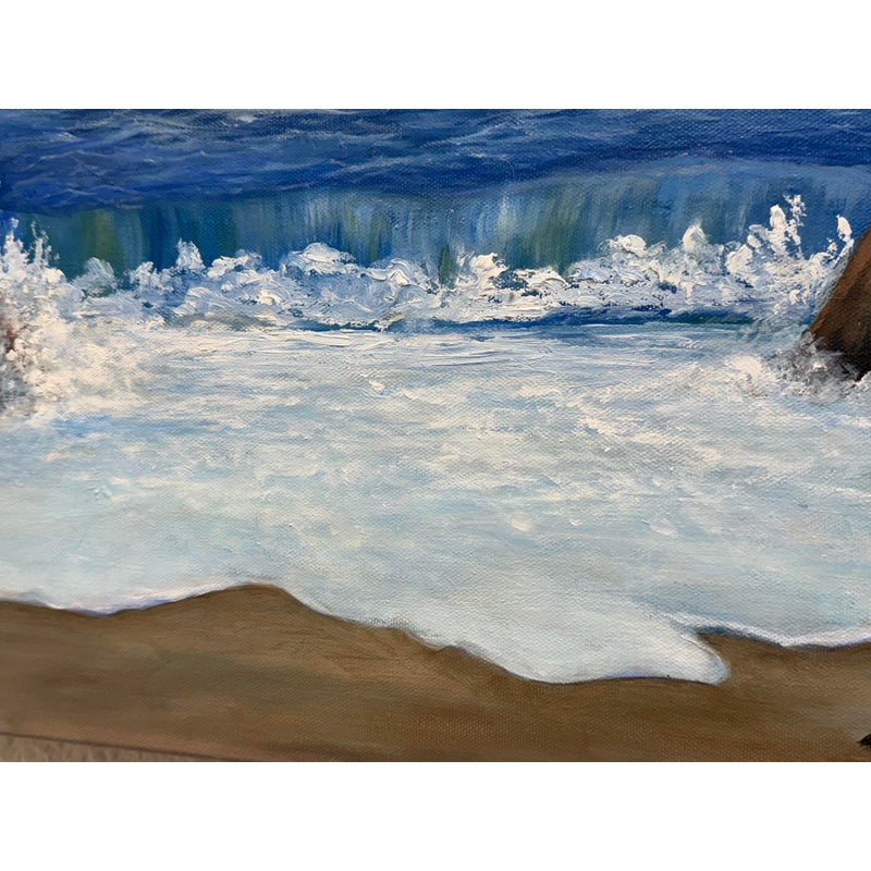 Design Plus Gallery presents a “Wavey Waves” Oil Painting by Ruth Rediger. This original seascape captures rolling surf meeting a sandy shoreline framed by rugged rocks and distant coastal cliffs. Layered tones of blue move across the water with white foam and spray, while a soft sky opens above the horizon for a calm, open-air perspective. The work is oil on stretched canvas with painted edges, and it is signed by the artist in the lower left. It is in good condition with visible and minimal wear from usage. Made in USA.