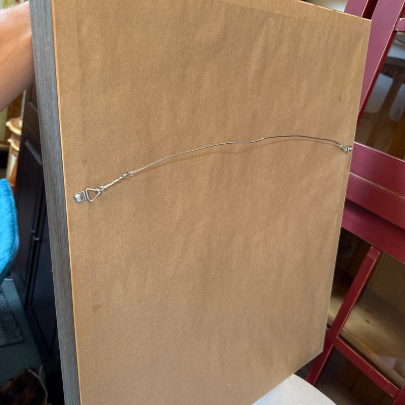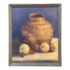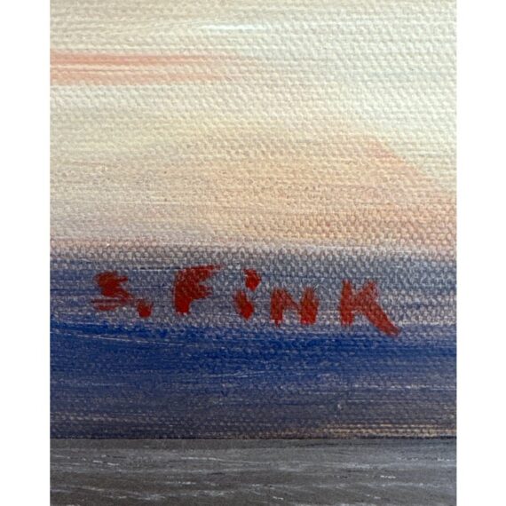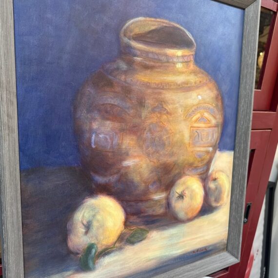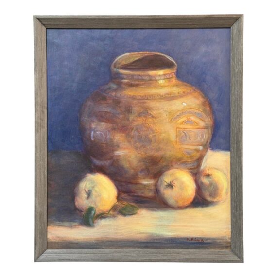Design Plus Gallery presents an Original Still Life Painting as Signed by Artist S. Fink. The painting has a soft blue background with a a table top of fruits and a wide bodied vessel. It is a nice study of shadow work and details are amateur/novice. The artist has signed S. Fink at the bottom right hand corner. The frame in gray wood is a to complement the artwork. Condition is good, minimal wear.