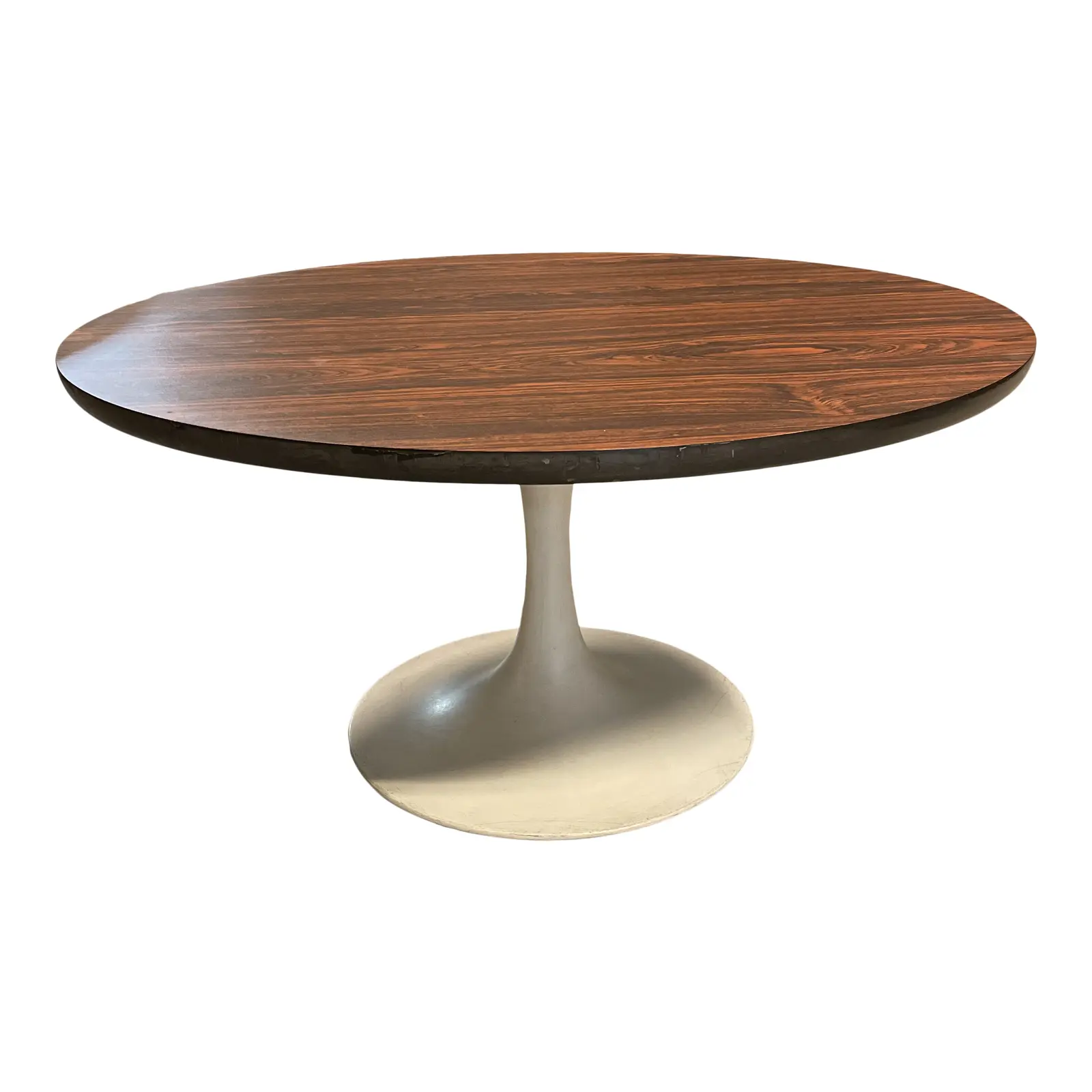 Design Plus Gallery presents a Mid 20th Century Saarinen Style Laminate Top Tulip Base Coffee Table. Powder coated metal base is an ivory white with visible wear due to age. Top is a faux rosewood laminate top with a black perimeter. Visible and minor wear.