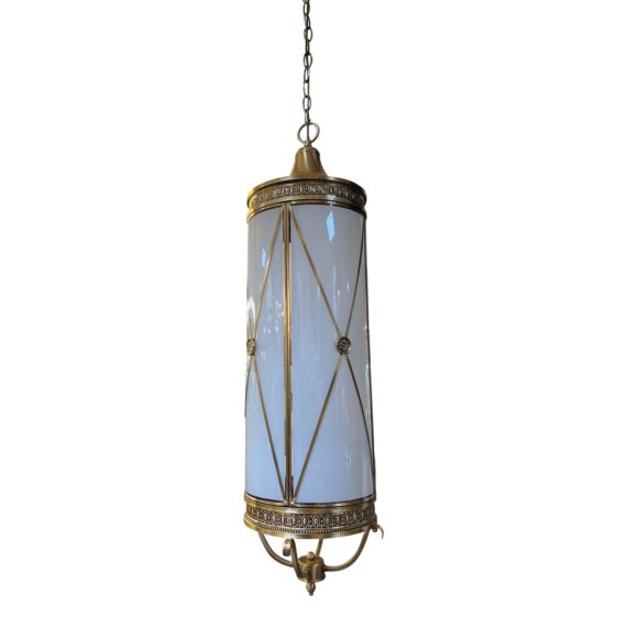 Design Plus Gallery presents the Darby Lantern Pendant by Safavieh. The ornate brass cage holds a frosted cylinder that diffuses the light from 6 Chandelier bulbs (not included) beautifully. New condition; little evidence of wear.