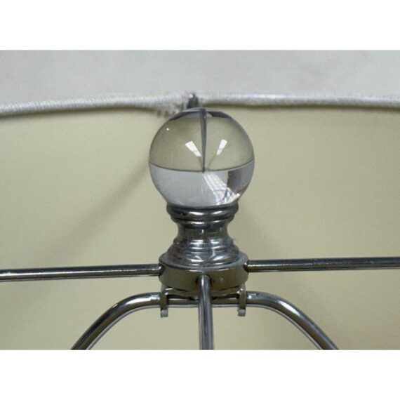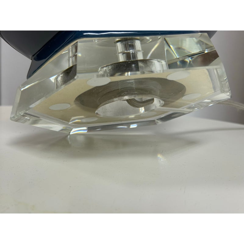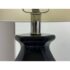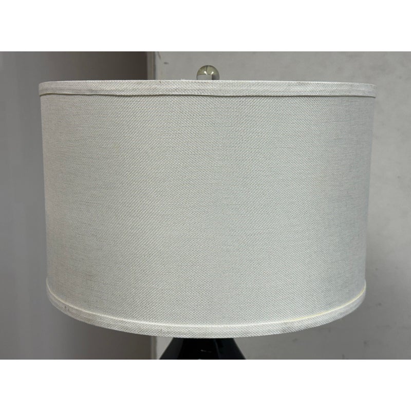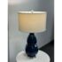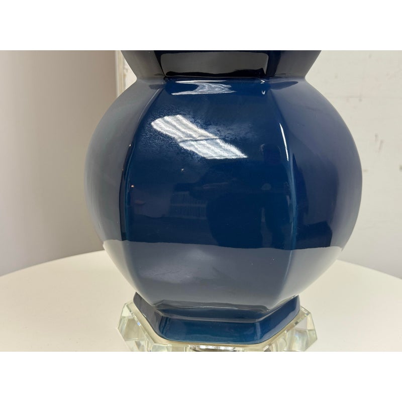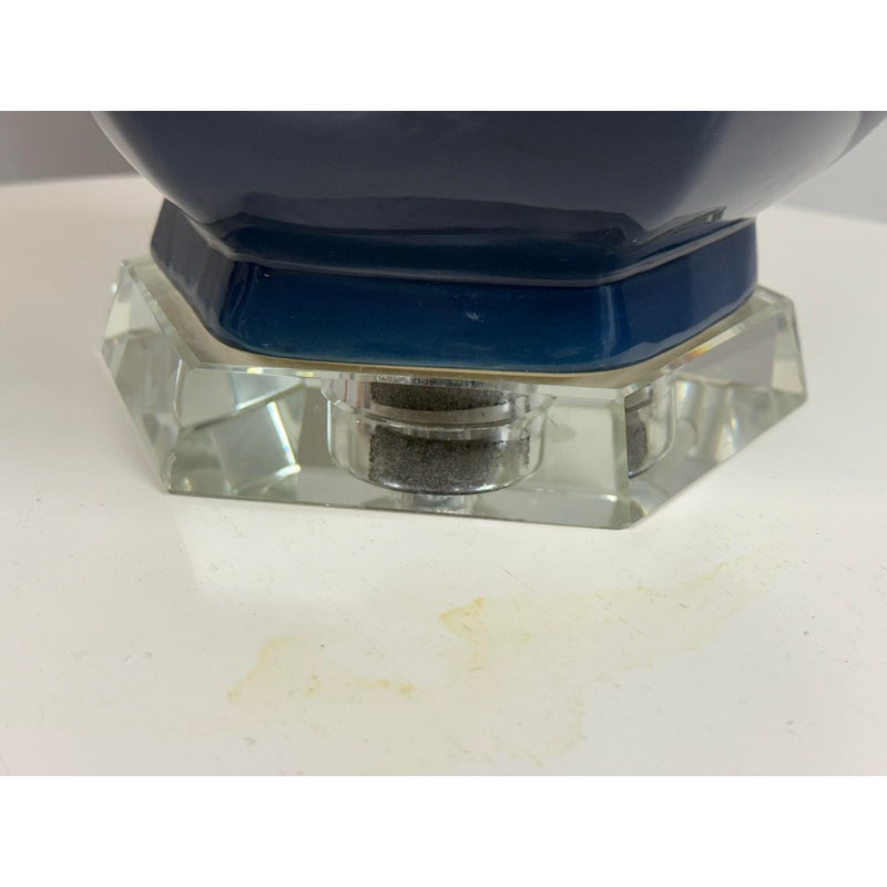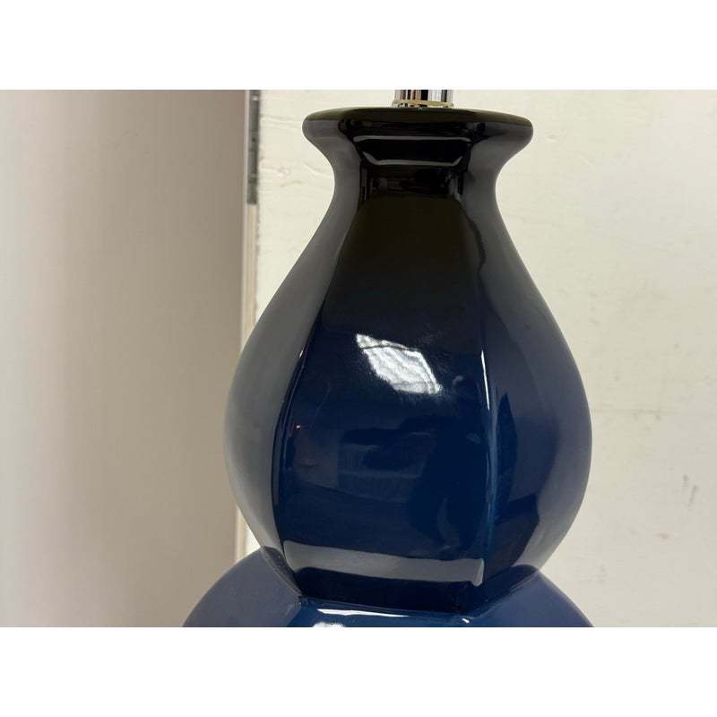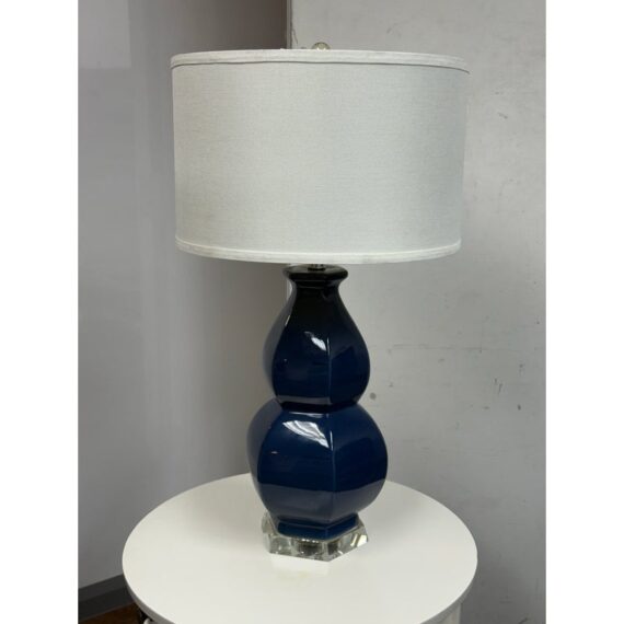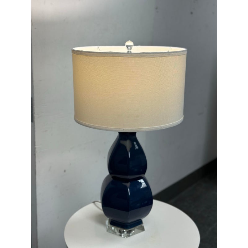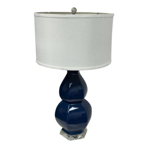 Design Plus Gallery presents the Navy Jupiter Table Lamp from Safavieh. This striking transitional lamp features a classic double gourd form from the Juniper table lamp, now updated with faceted detailing in navy glazed ceramic. The textured white cotton drum shade and modern acrylic pedestal and finial add a touch of contemporary elegance. The base and finial are finished in highly polished silvertone, providing a final sleek accent. Is in good condition for its usage with minimal visible wear.