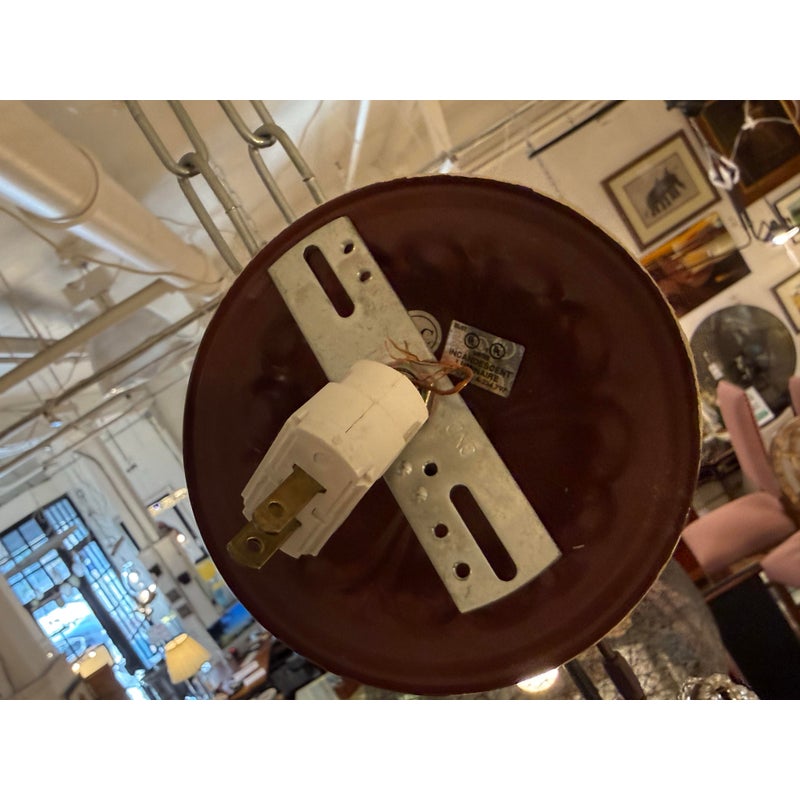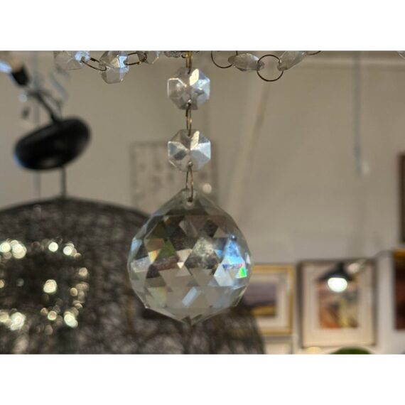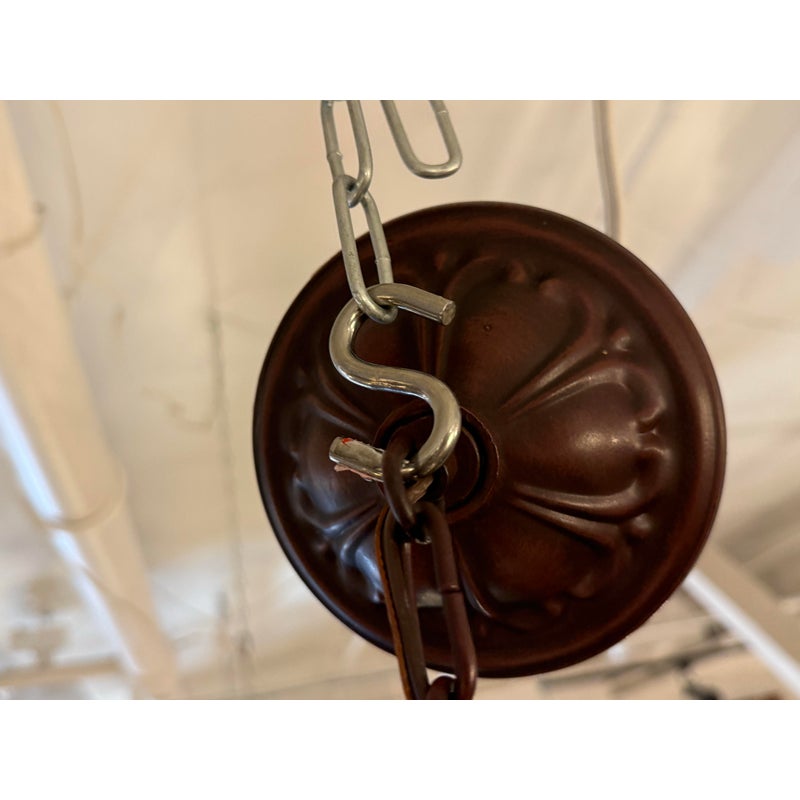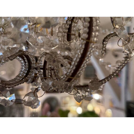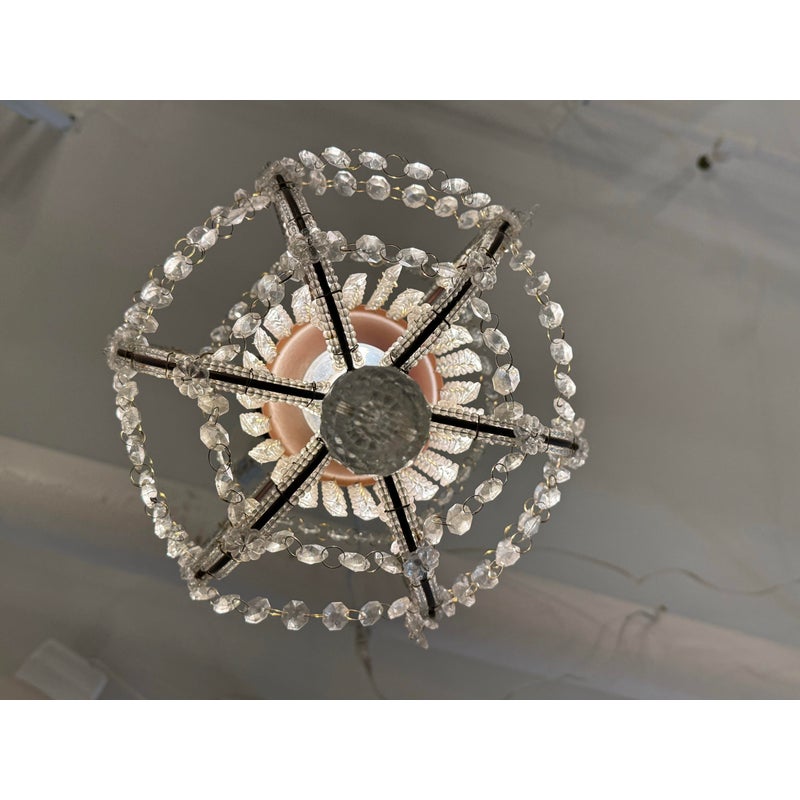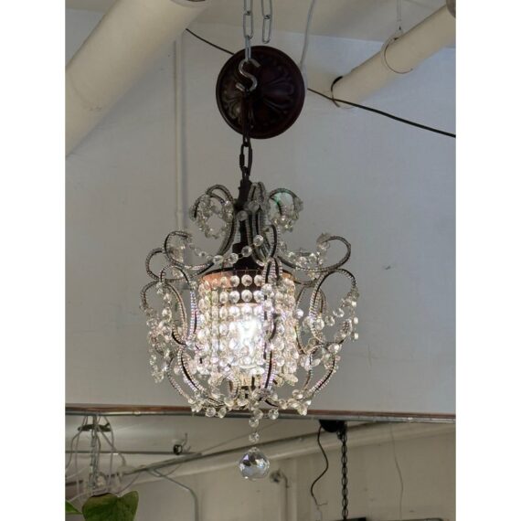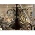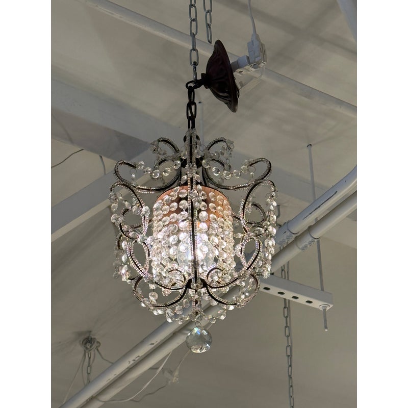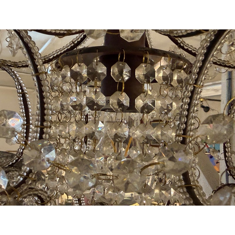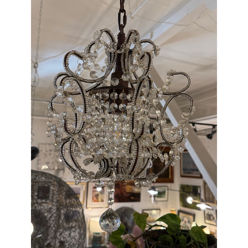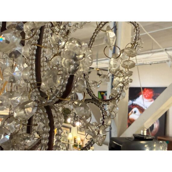 Design Plus Gallery presents a Luna Chandelier from Safavieh. Inspired by the European style residences that line the poshest boulevard in Buenos Aires, this contemporary spin on the traditional chandelier. Its brown finish iron frame is dramatically juxtaposed with the infinite sparkle of crystal. In good condition, missing a few crystals.