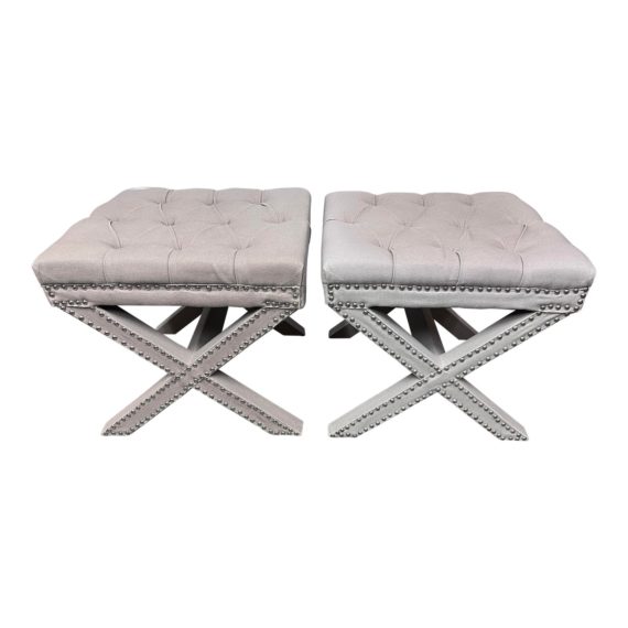 Design Plus Gallery presents a Pair of Patrice Tufted + Nailhead Taupe Ottomans from Safavieh. A design style that is ages-old with its X bench, cross bench, style. The Patrice is dressed up in taupe toned linen that is biscuit tufted and accented with silver nailheads. The birch wood ottomans complement any design style, from traditional to soft contemporary. Some small surface wear but overall good condition. Visible bleaching on fabric on one corner of seat.