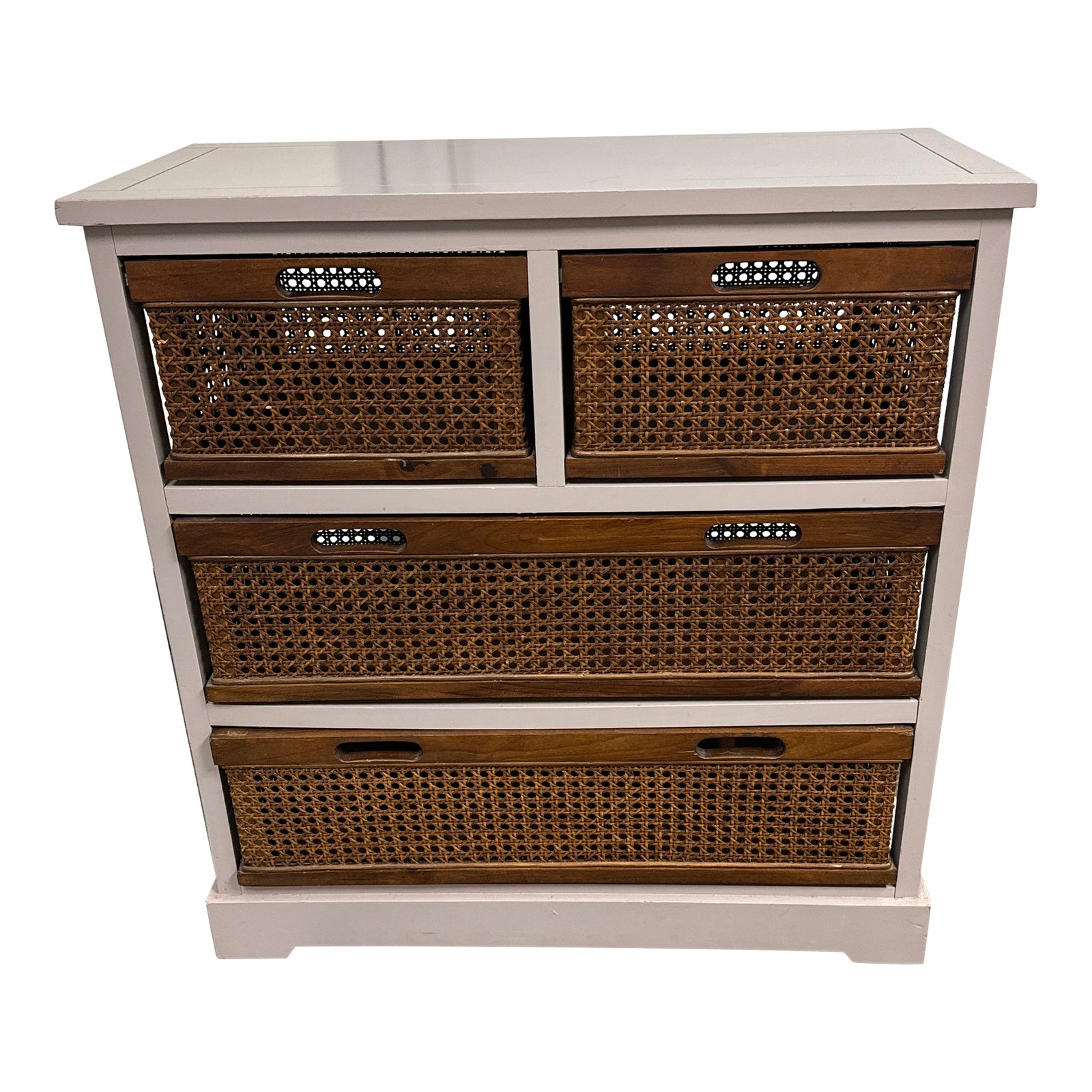 Design Plus Gallery presents the Jackson Storage Unit by Safavieh. A British Colonial inspired unit evokes locales abroad and features a relaxed atmosphere with generous storage. Made from pine wood in gray finish with amber toned cane baskets with cutout handles for easy of access. Is in good condition with minimal signs of wear.