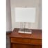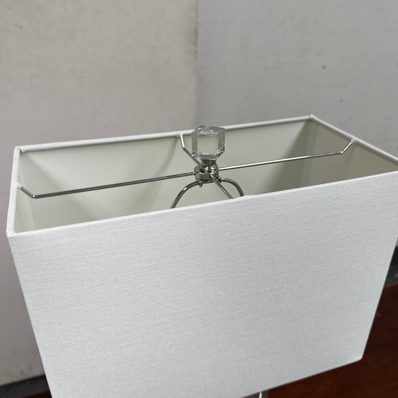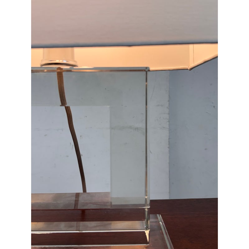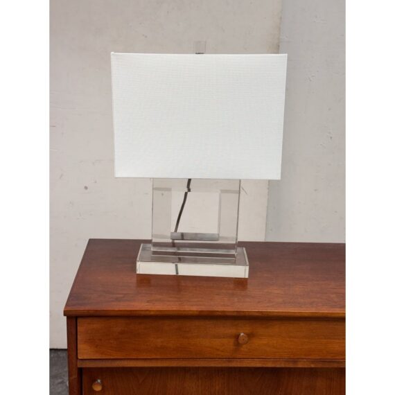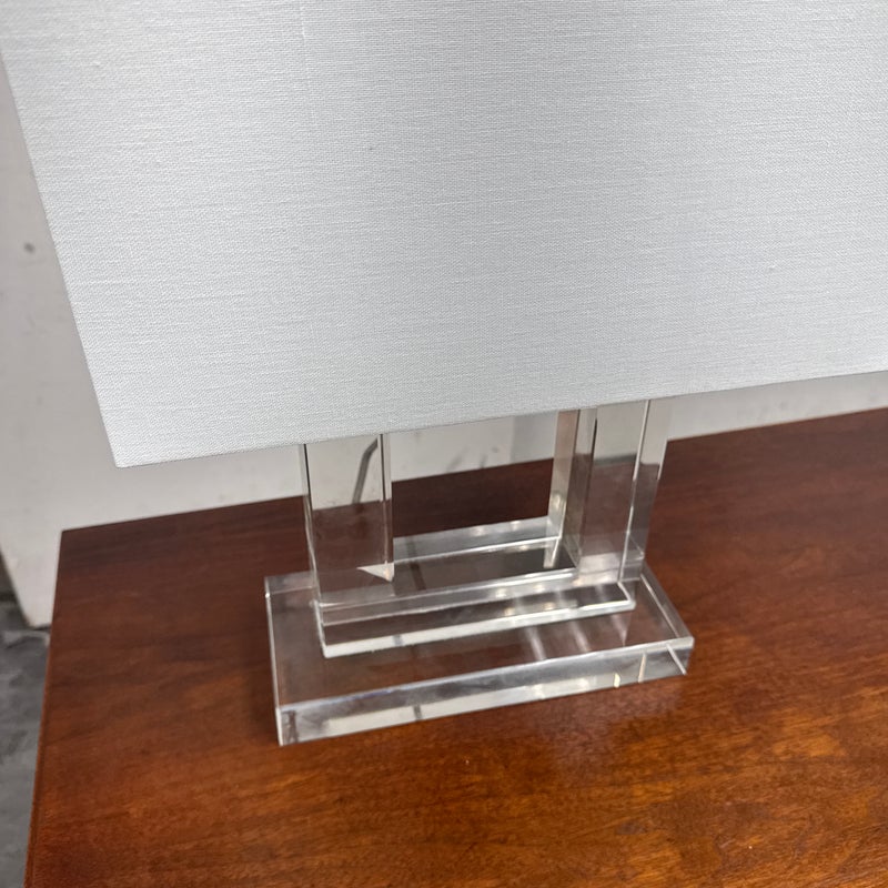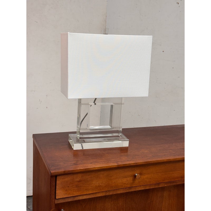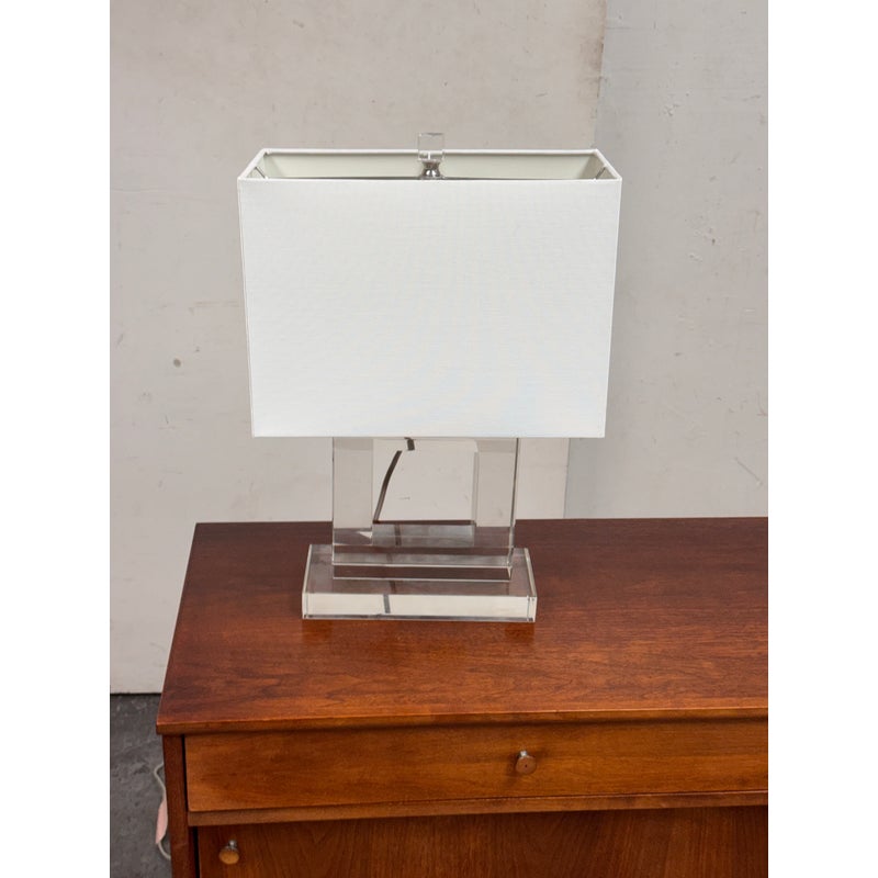 Design Plus Gallery presents a Town Square Crystal Table Lamp from Safavieh. This contemporary table lamp has a clear lucite base and a clean-lined white rectangular shade. The transparent stacked base creates a floating, architectural look. Its neutral palette allows it to pair easily with a variety of furniture styles. The rectangular shade provides balanced illumination while maintaining a streamlined profile. It is in good condition, visible and minimal wear from usage.