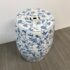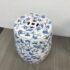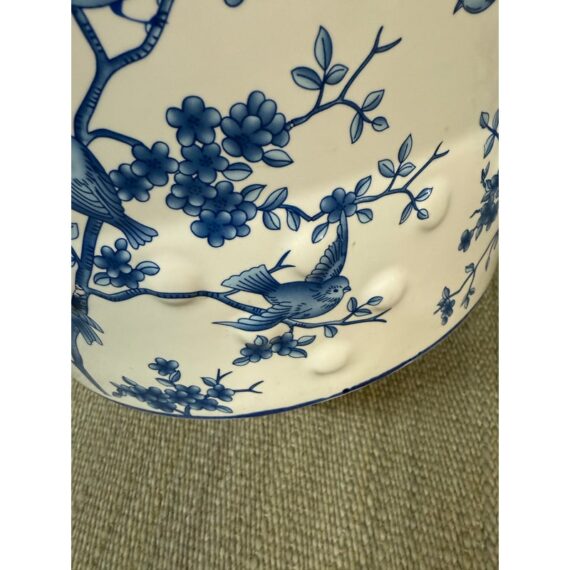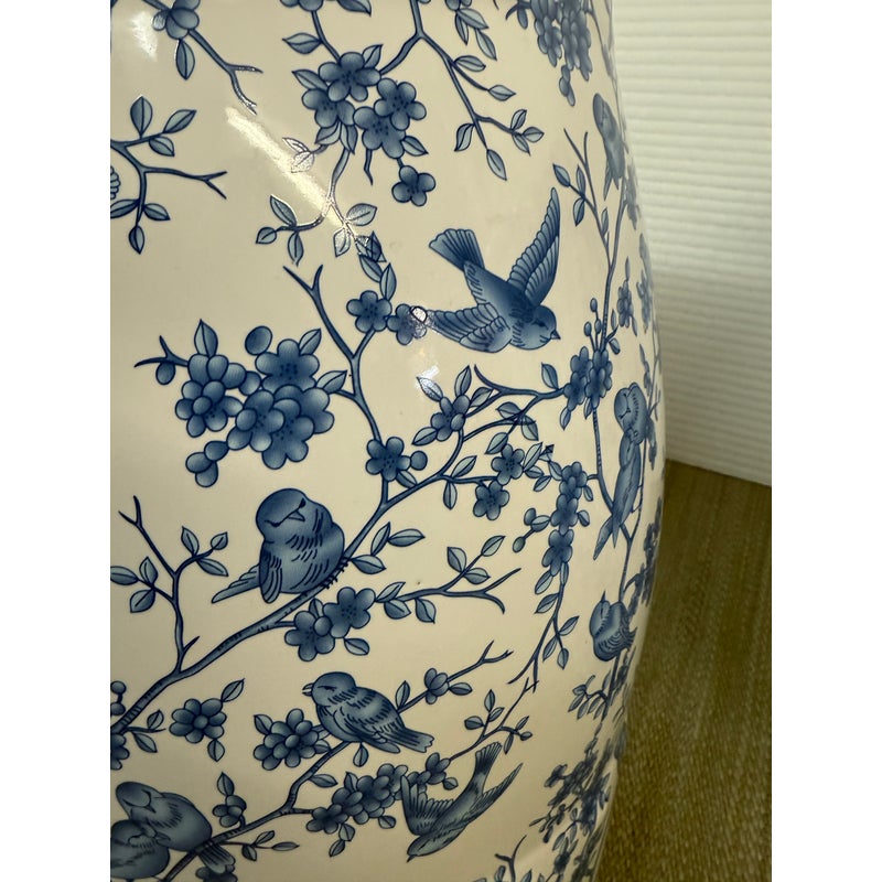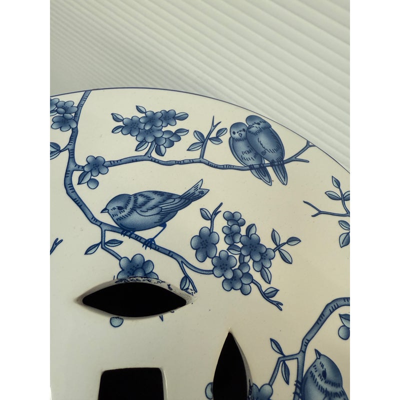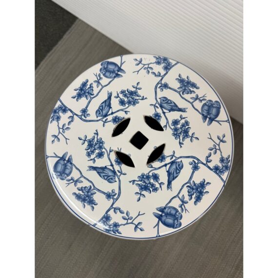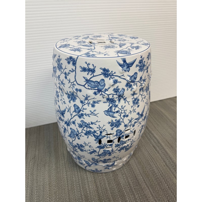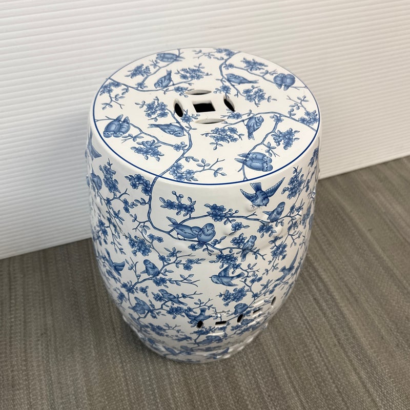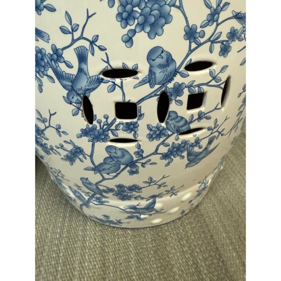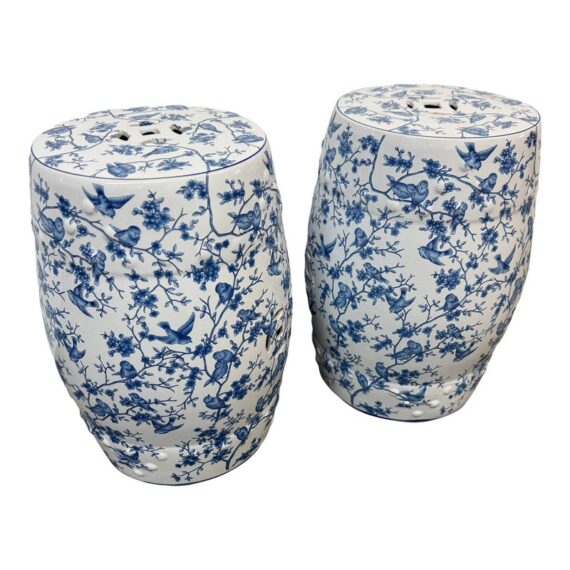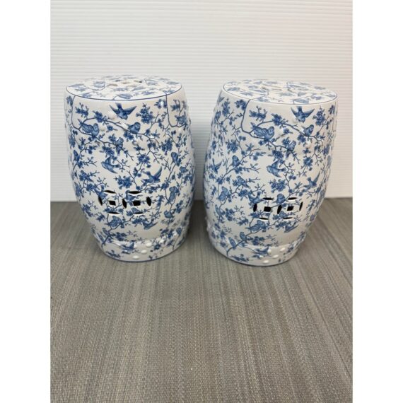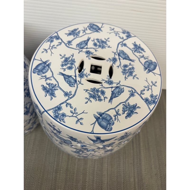 Design Plus Gallery presents a pair of Chinoiserie Garden Stools by Safavieh Home. Classic white ceramic, pierced, is decorated with beautiful blue vines, branches and birds. A simple silhouette that will find use as seating, table or sculpture indoors or out. Little wear; condition is good.