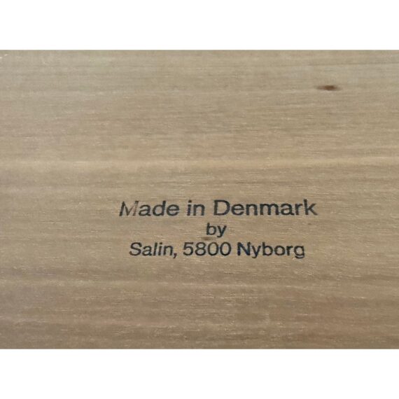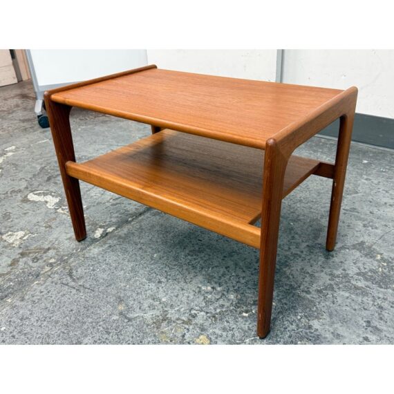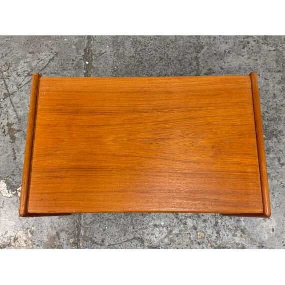 Design Plus Gallery presents a Mdi 20th Century Side Table from Salin Nyborg. This teak two-tier table (Model 5800) shows the sculptural lines and curved joinery associated with Scandinavian modern design. The rectangular top is framed by softly rounded edges, while the open lower shelf adds depth to the profile and emphasizes the architectural form. The maker’s stamp appears on the underside. This is a discontinued model with the brand and is in good condition with visible and minimal wear from usage. Made in Denmark.
