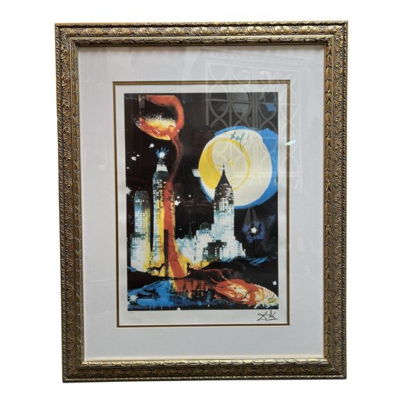 Design Plus Gallery presents Moon on Manhattan, by Salvadore Dali. A limited edition 254/500 Printograph based on an original oil on canvas circa 1971, the contemporary cityscape explodes with rich color and light against a night sky. Triple matted and custom gilt framing shows the piece beautifully. Signed and attached certificate of authenticity.