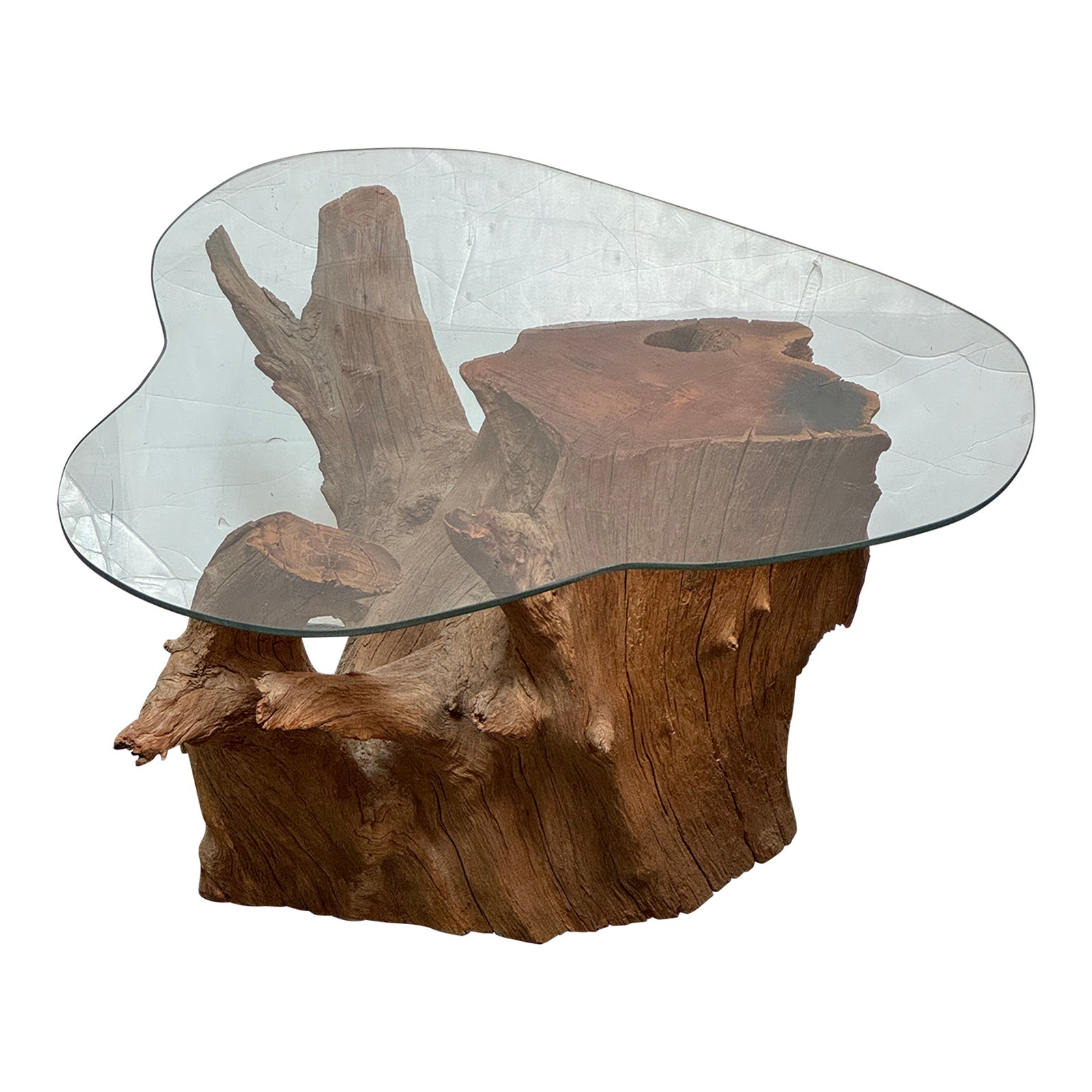 Design Plus Gallery presents a Salvaged Teak Tree Root + Glass Side Table. Made from a salvaged teak root base, this coffee table exudes natural beauty and showcases the unique and original character of the wood. The live edge design adds an organic and rustic touch, making it a one-of-a-kind. Complementing the teak root base is a custom organic shape glass top surface. The smooth and transparent glass enhances the natural beauty of the teak wood, allowing the intricate grains and knots to shine through. This combination of materials creates a harmonious balance between modern elegance and raw, natural charm. Not only does this coffee table bring a touch of nature into your home, but it also adds a sense of tranquility and grounding to your space. The earthy tones of the teak wood and the simplicity of the design enable this coffee table to seamlessly blend with various interior styles, whether it be modern, Scandinavian, or bohemian. In good condition.