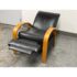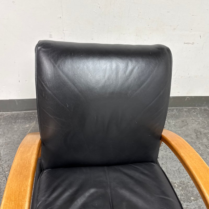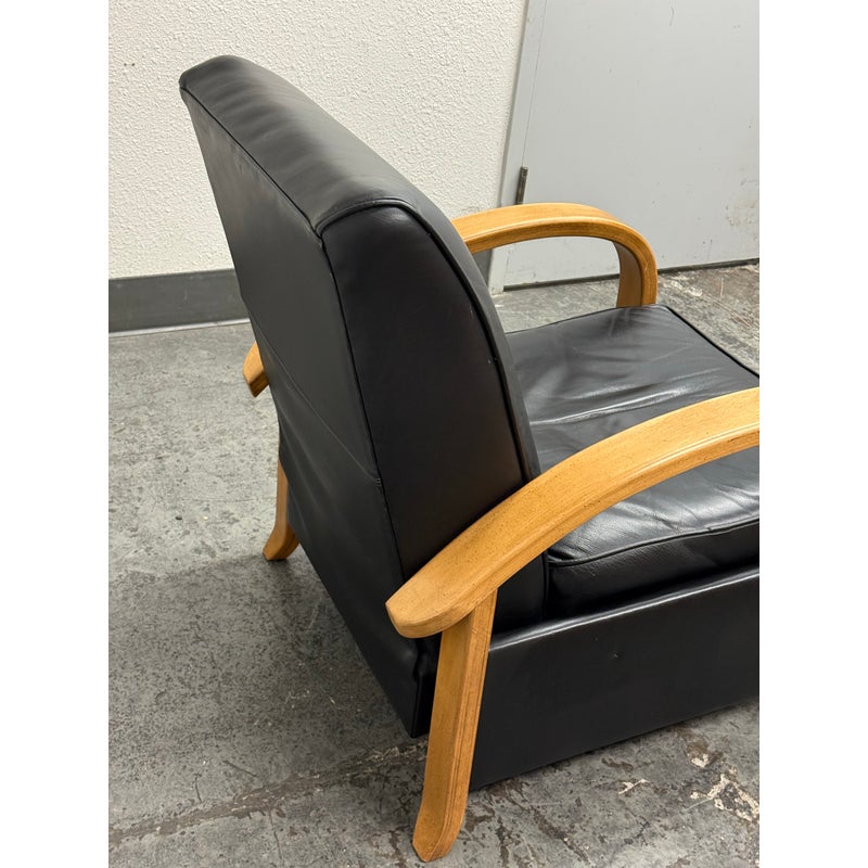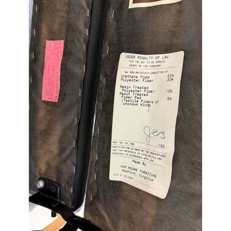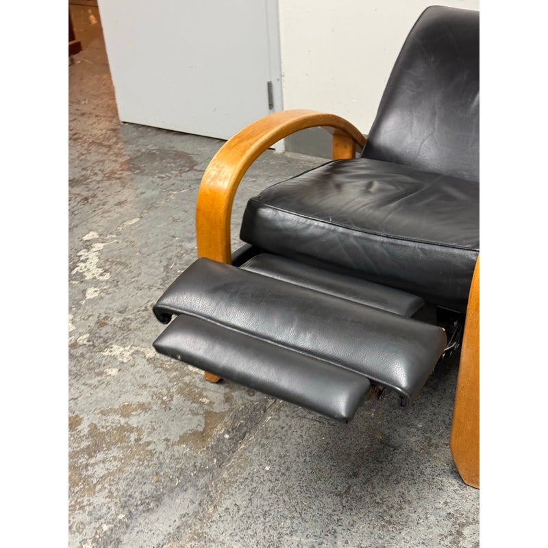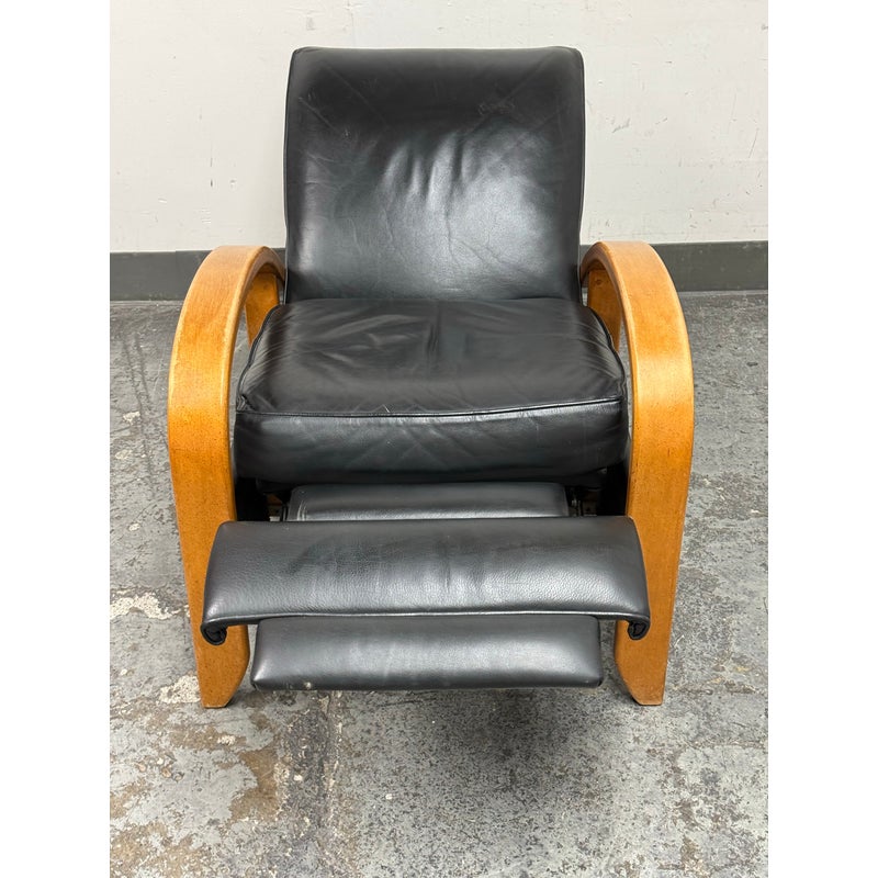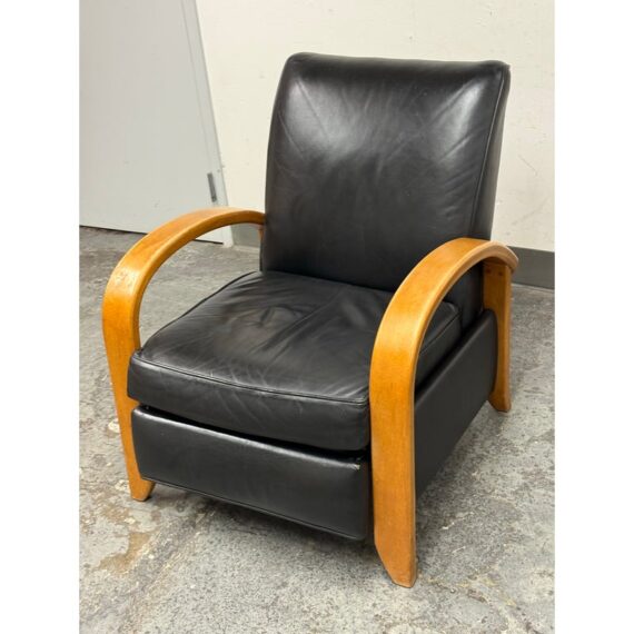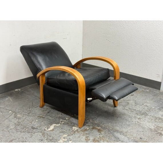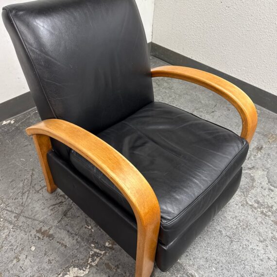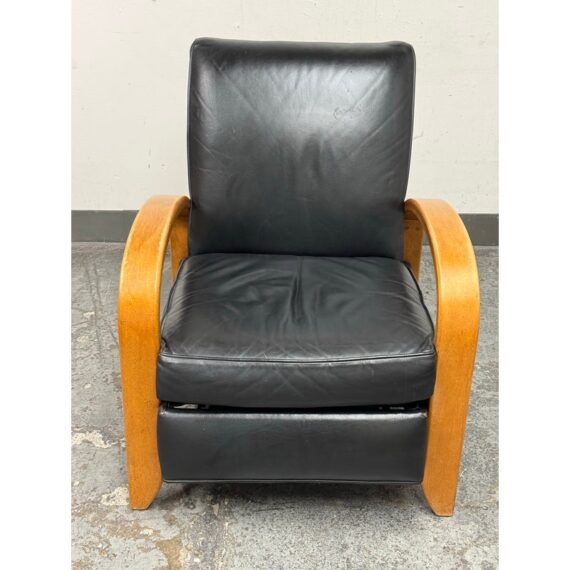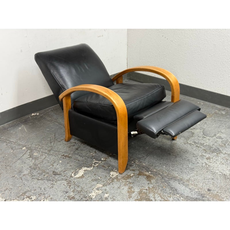 Design Plus Gallery presents a Leather Recliner from Sam Moore Furniture. The post modern styled recliner is meant for everyday comfort as it allows you to relax with ease without overwhelming the room. This inviting recliner pairs tailored leather upholstery with gracefully curved wood arms, creating a balanced look that works well in both classic and contemporary interiors. Upholstered in their Arizona Onyx leather with the sculpted Tawyn stained wood finish to its frame creates an appealing visual contrast for your home. In good condition visible and lived in wear. Made in the USA.