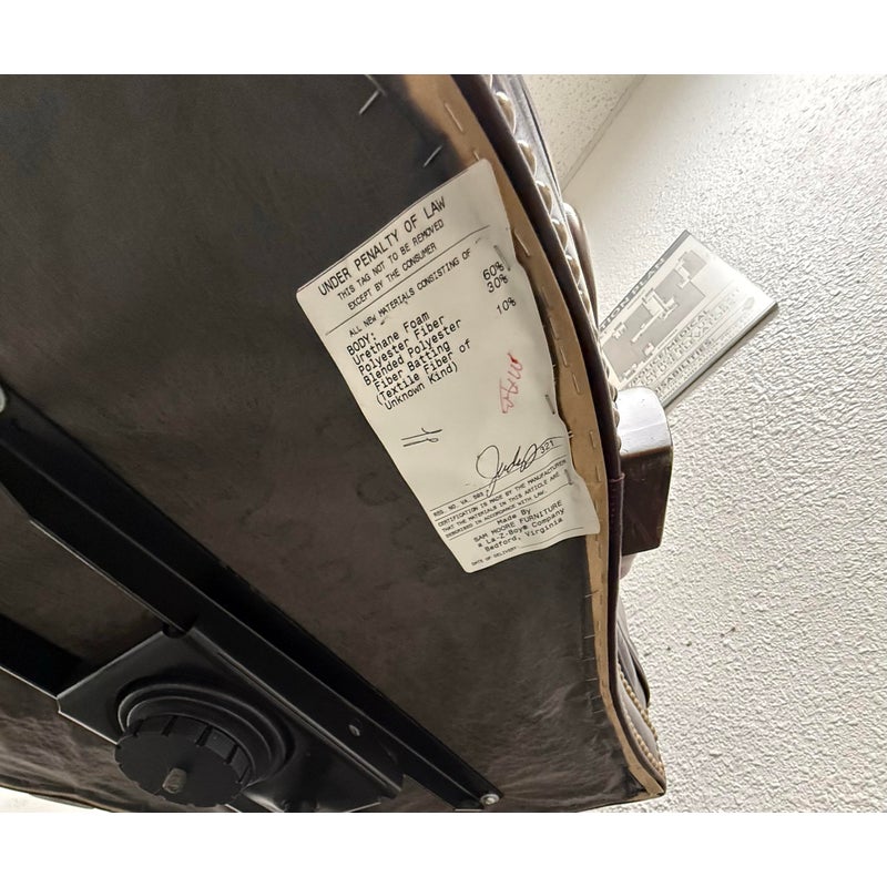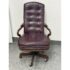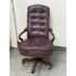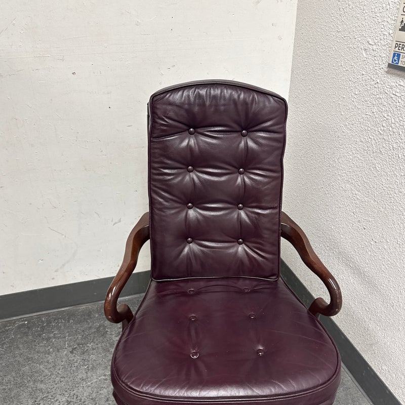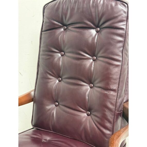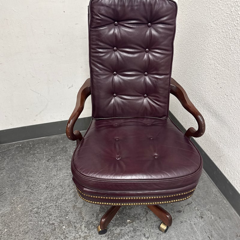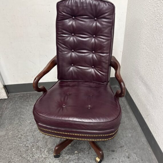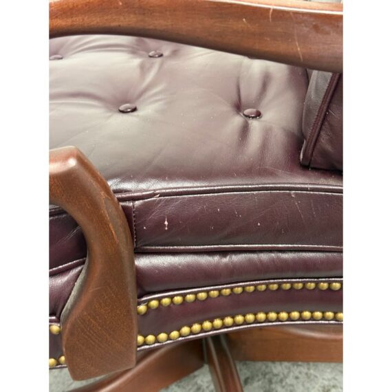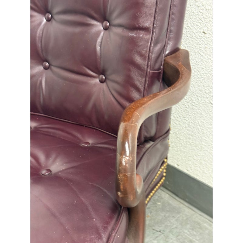 Design Plus Gallery presents a Leather Executive Office Chair from Sam Moore. The very comfortable desk chair with padded seat and back has oxblood leather with nailhead trim connecting the upholstery to the mahogany finished frame. There are button tufts on the high back and seat as well, with a seat that tilts backwards. Overall the chair is in good condition for its usage.