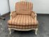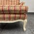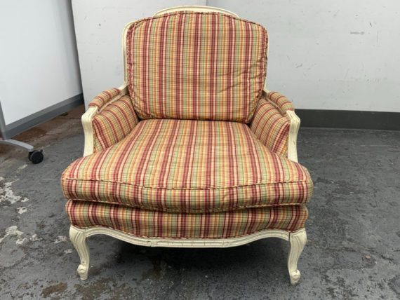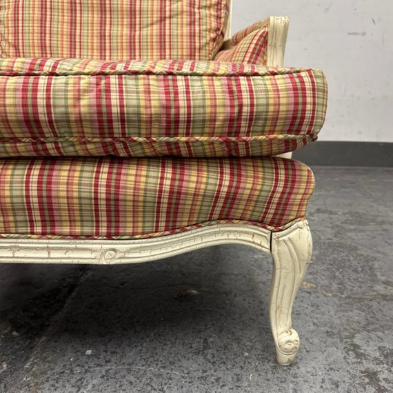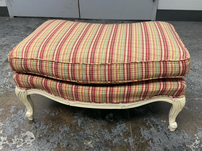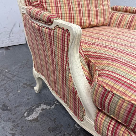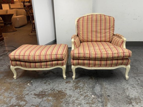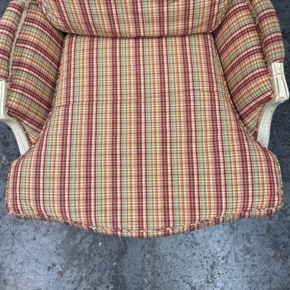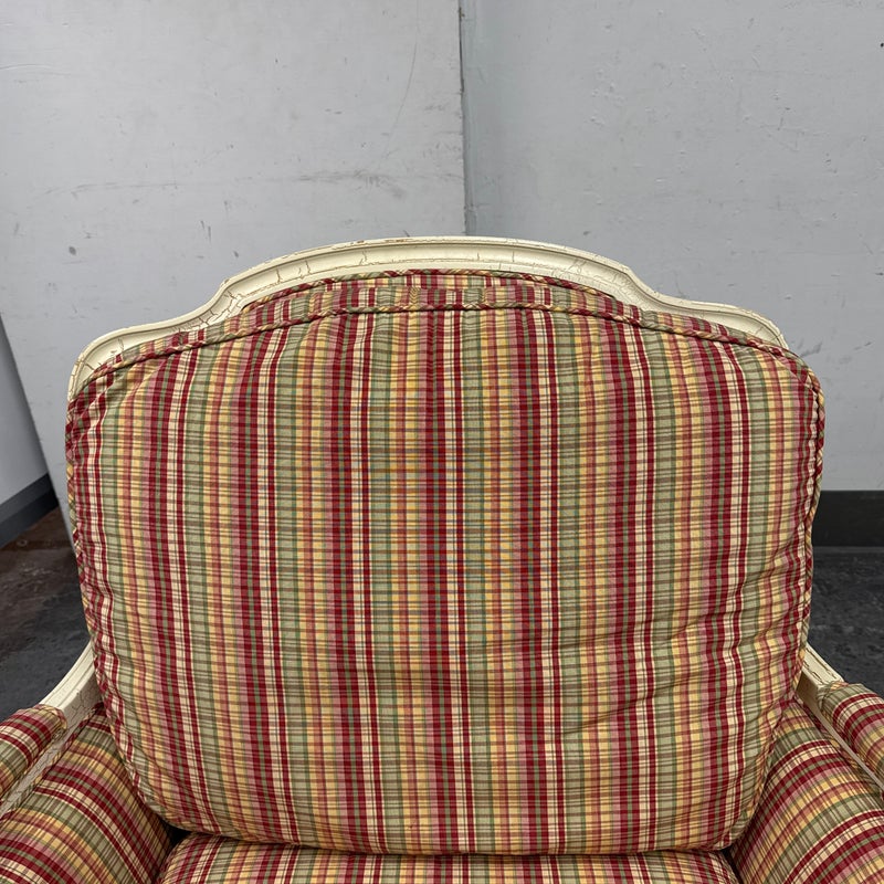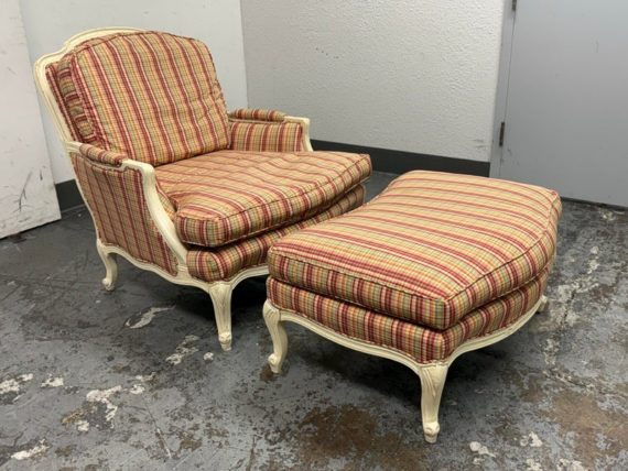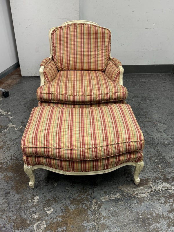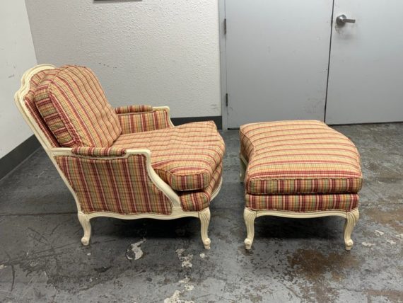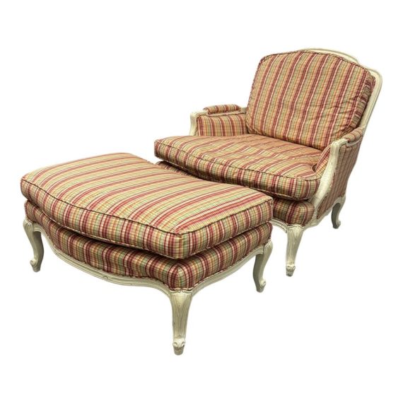 Design Plus Gallery present a Plaid Berger Chair + Ottoman from Sam Moore. Finely crafted in Louis XV style with Christmas like ribbon upholstery in green and red with a white wooden frame. Matching ottoman for leisure. Some visible wear to the wood frame and a stain on the ottoman cushion, consistent with usage. Made in USA.